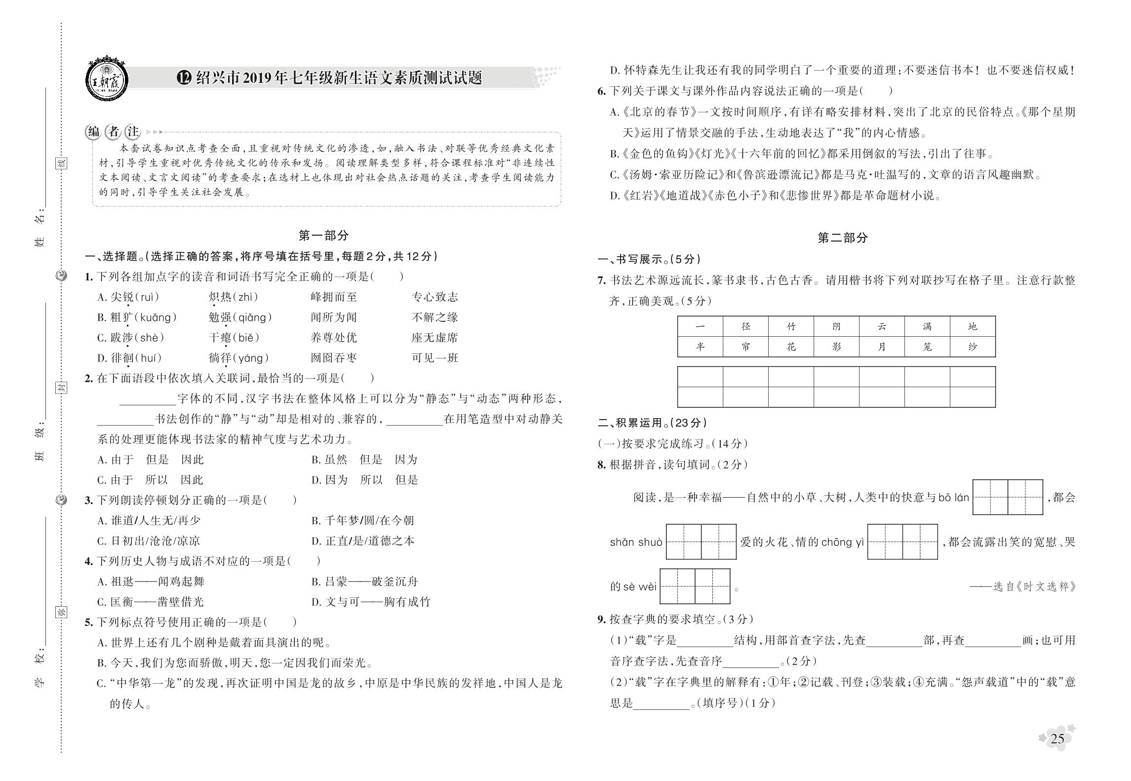 小升初语文绍兴市2019年七年级新生语文素质测试试题【12】