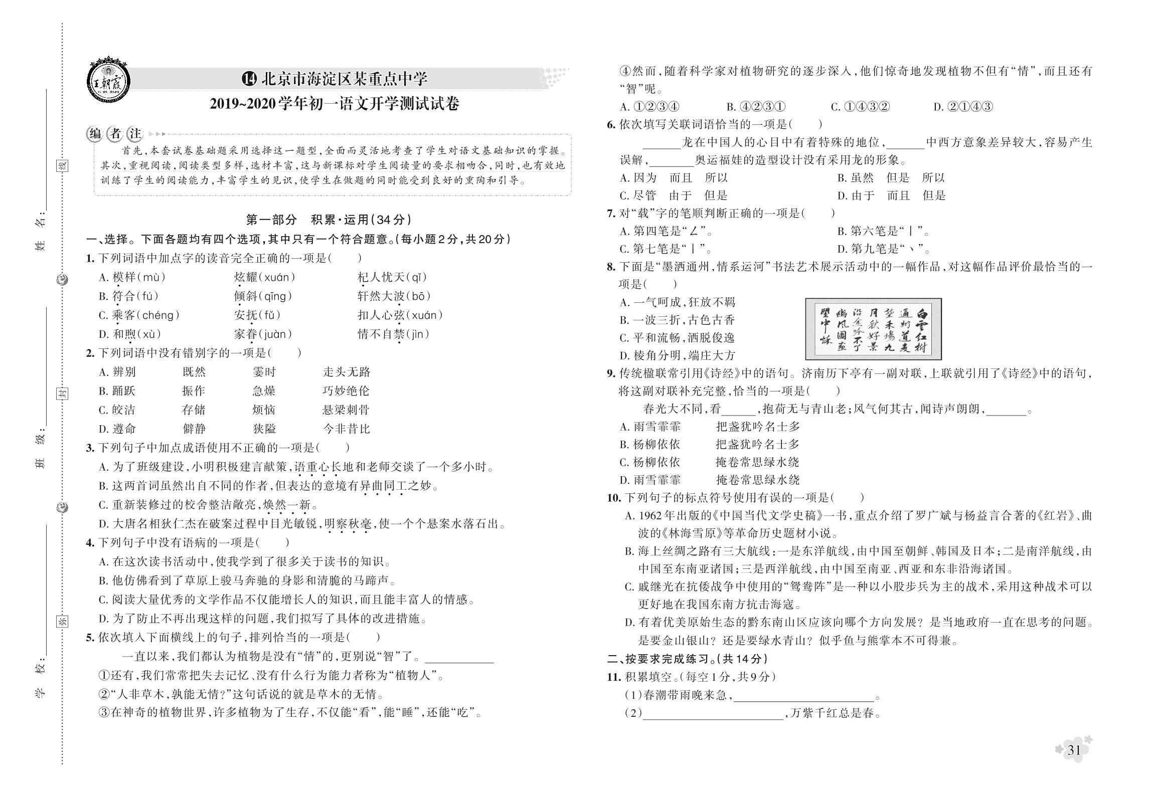 小升初语文北京市海淀区某重点中学2019~2020学年初一语文开学测试试卷【14】