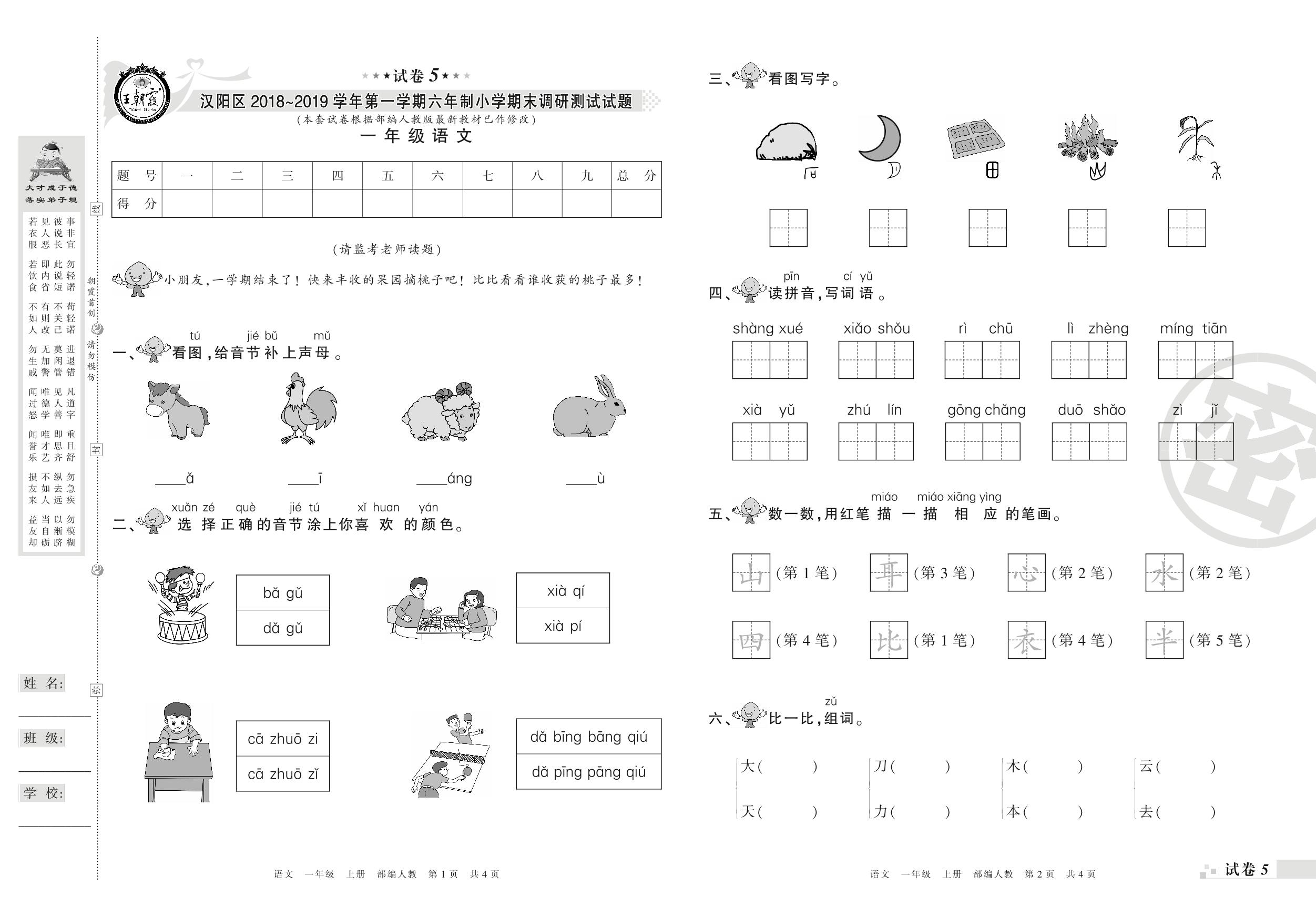 2018-2019学年第一学期武汉市汉阳区一年级语文试卷(人教版)【5】