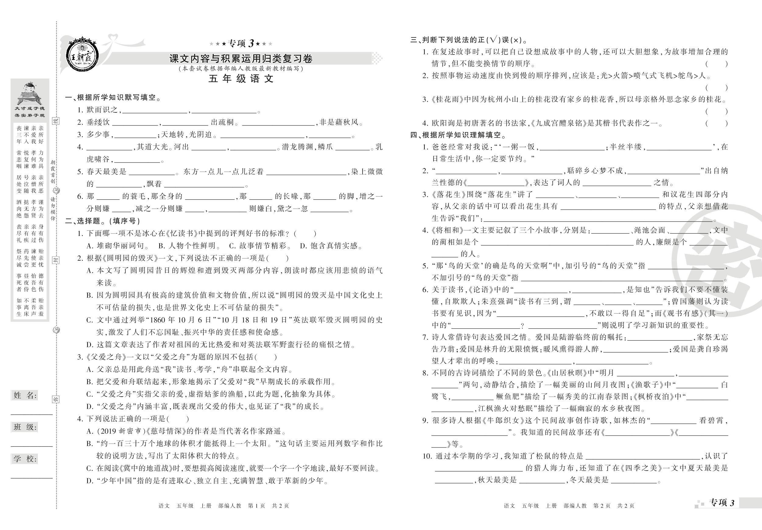 王朝霞期末专项卷——课文内容与积累运用、课内阅读与写作真题归类复习卷五年级上册语文(人教版)_R210801194435【0】
