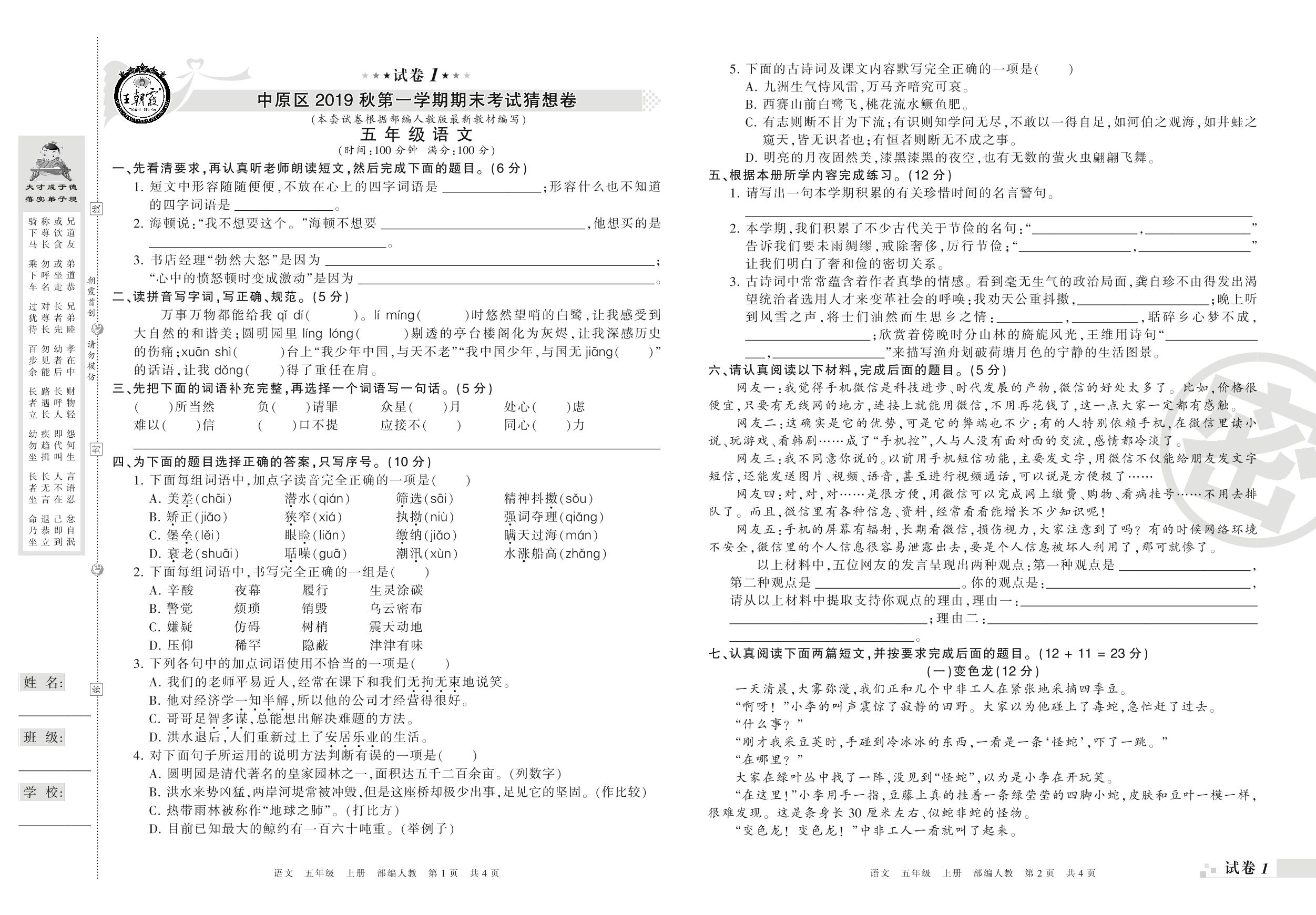 2018-2019学年第一学期郑州市中原区猜想卷五年级语文试卷(人教版)_R210801194440【1】