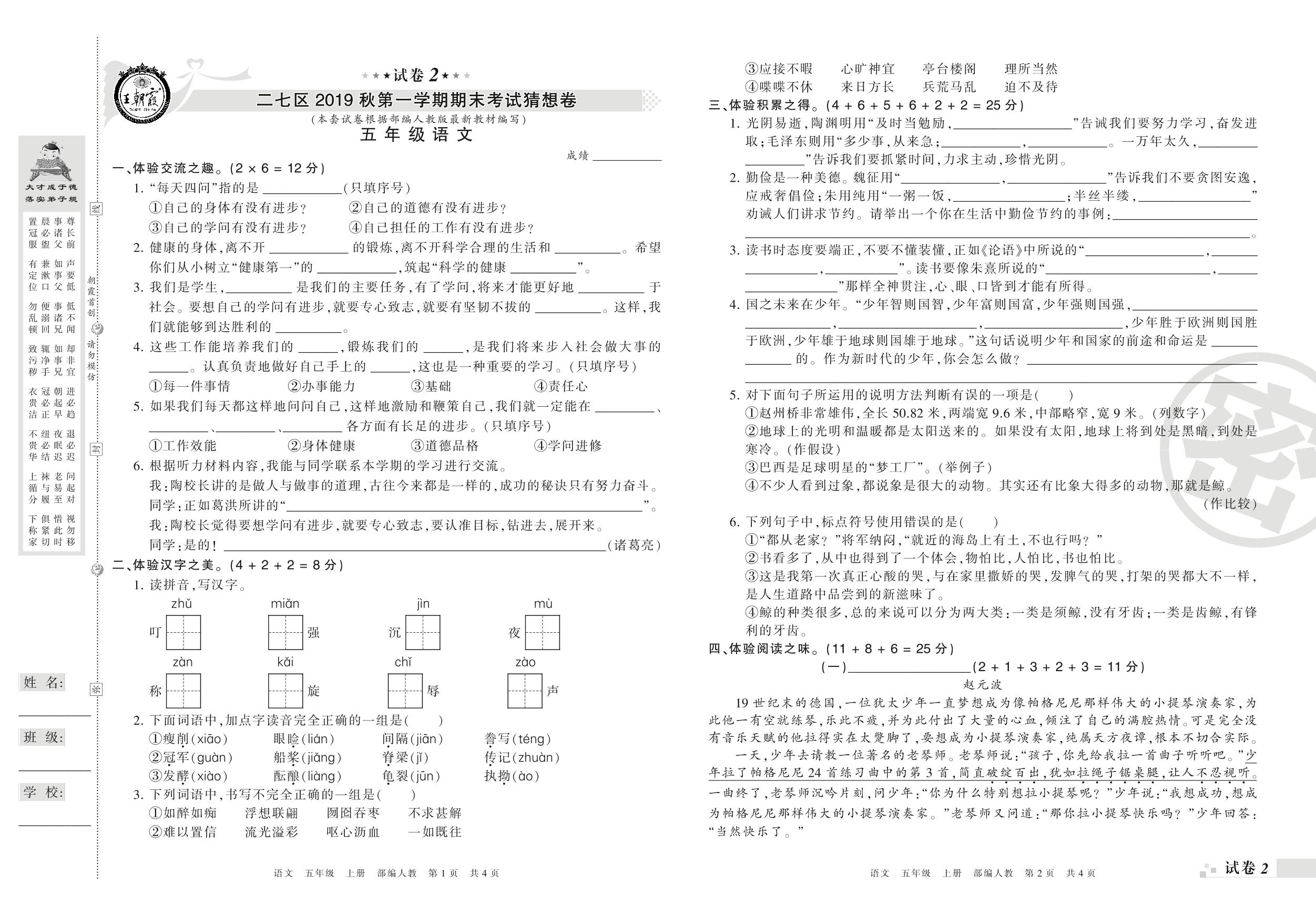 2018-2019学年第一学期郑州市二七区猜想卷五年级语文试卷(人教版)【2】