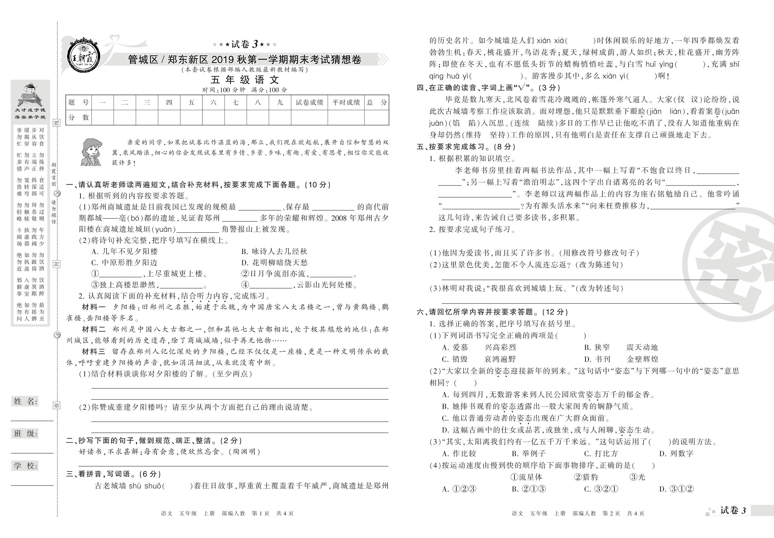 2018-2019学年第一学期郑州市管城区、郑东新区猜想卷五年级语文试卷(人教版)【3】
