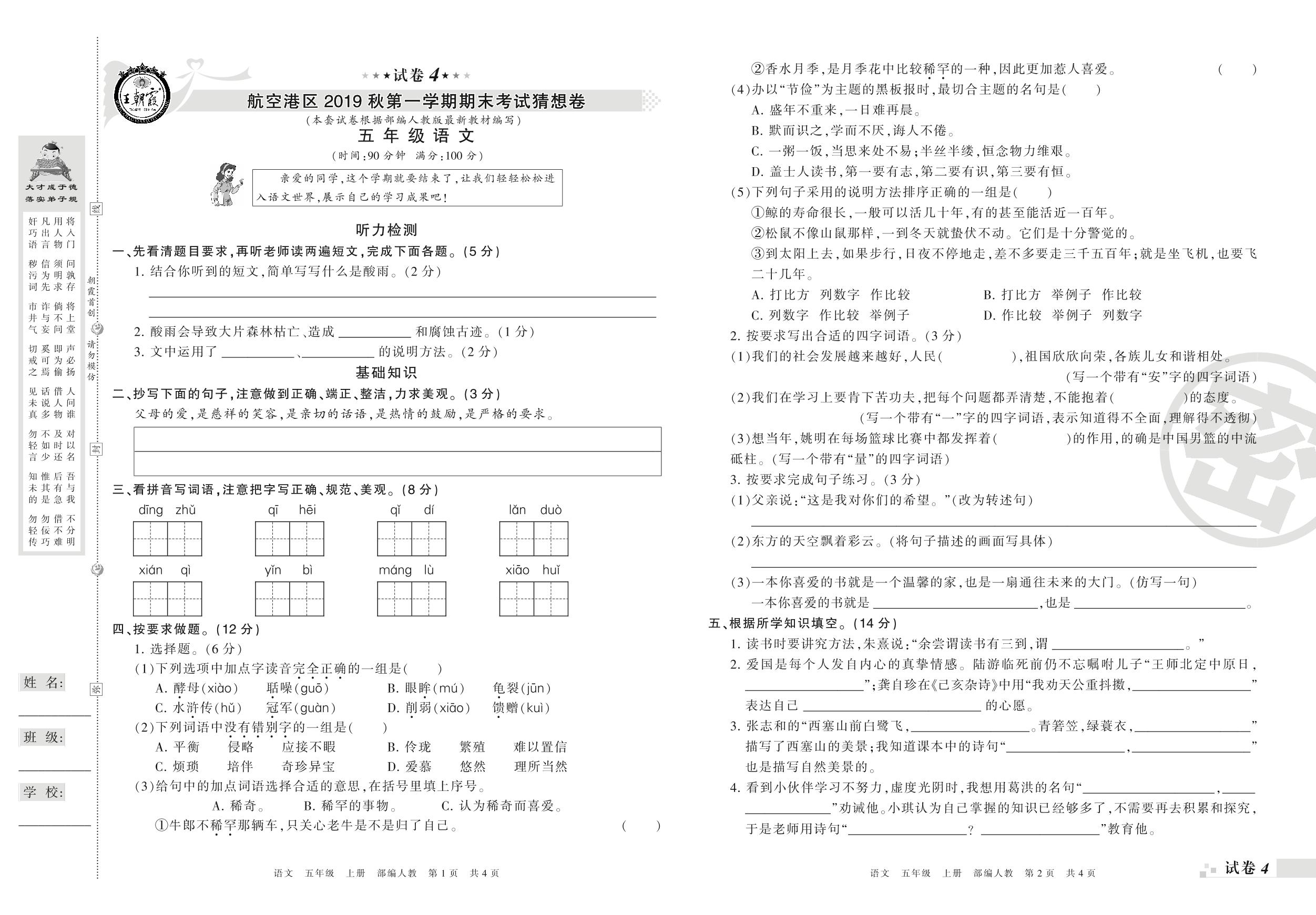 2018-2019学年第一学期郑州市航空港区猜想卷五年级语文试卷(人教版)【4】