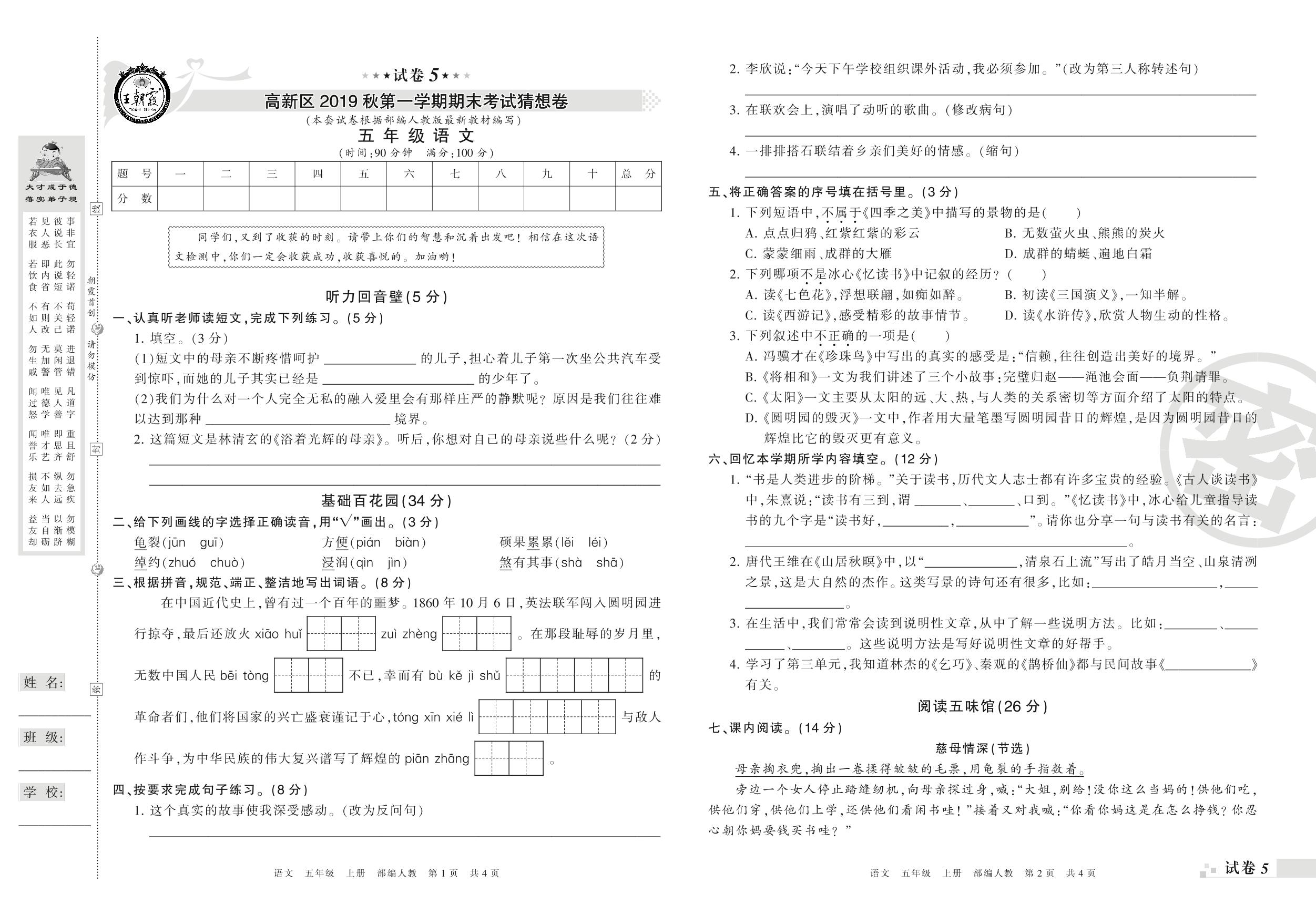 2018-2019学年第一学期郑州市高新区猜想卷五年级语文试卷(人教版)【5】