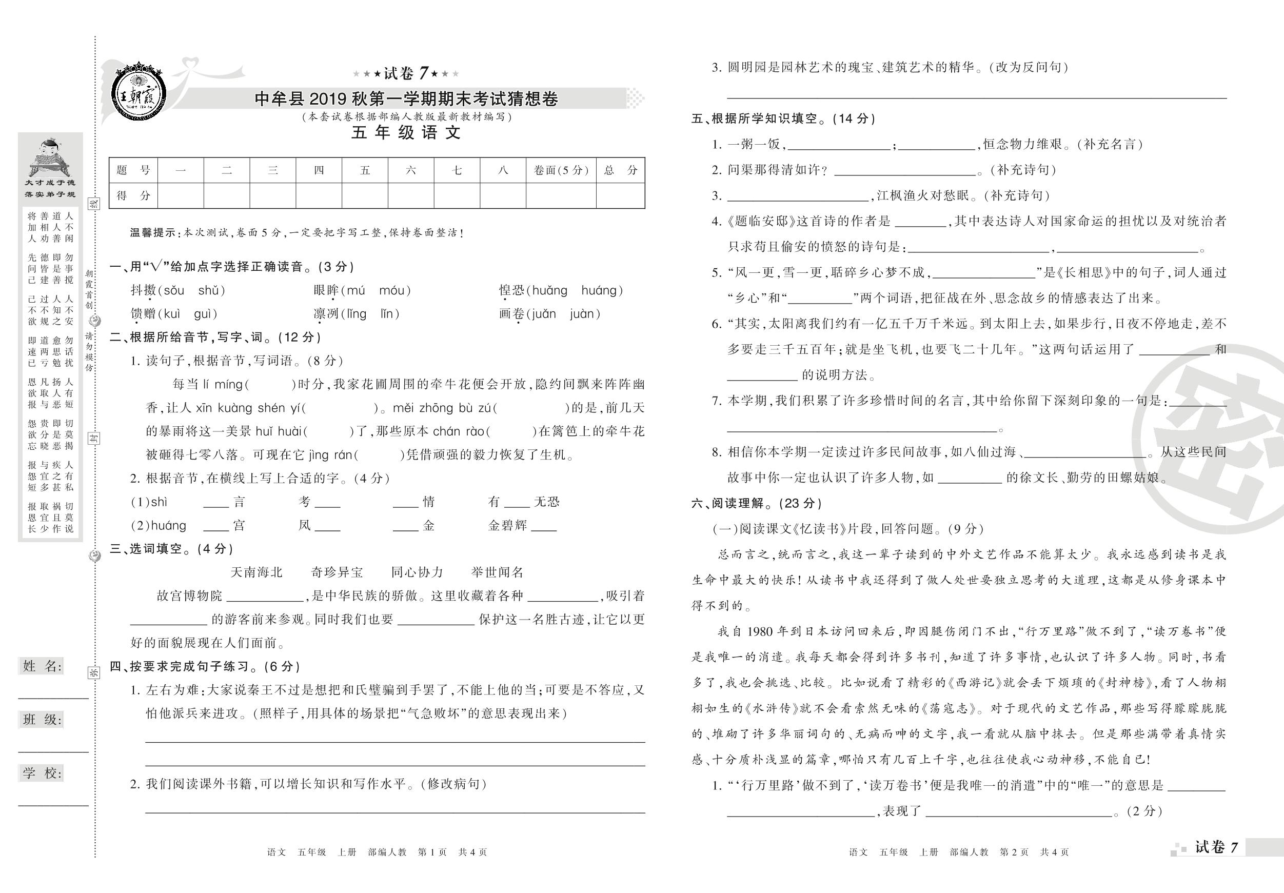 2018-2019学年第一学期郑州市中牟县猜想卷五年级语文试卷(人教版)【7】