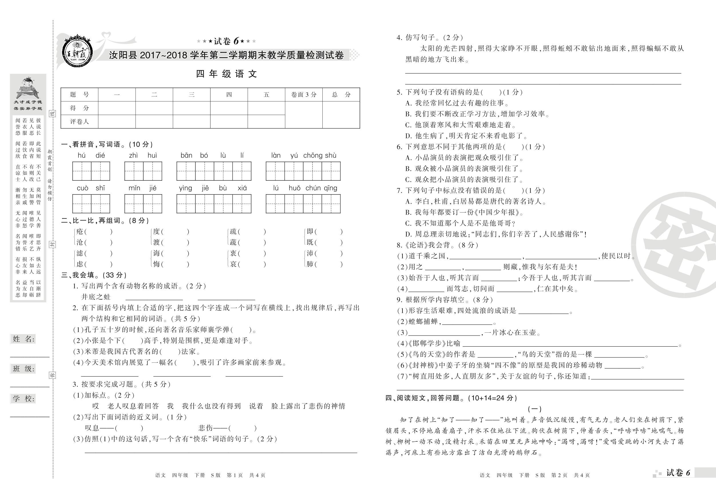 2017-2018学年第二学期洛阳市汝阳县四年级语文试卷(S版)【6】