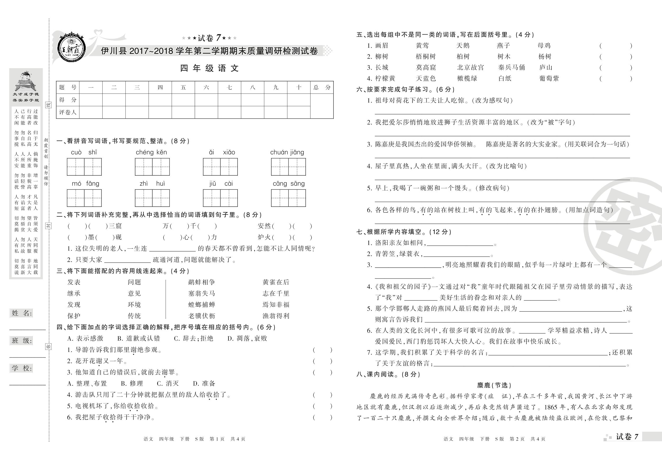 2017-2018学年第二学期洛阳市伊川县四年级语文试卷(S版)【7】