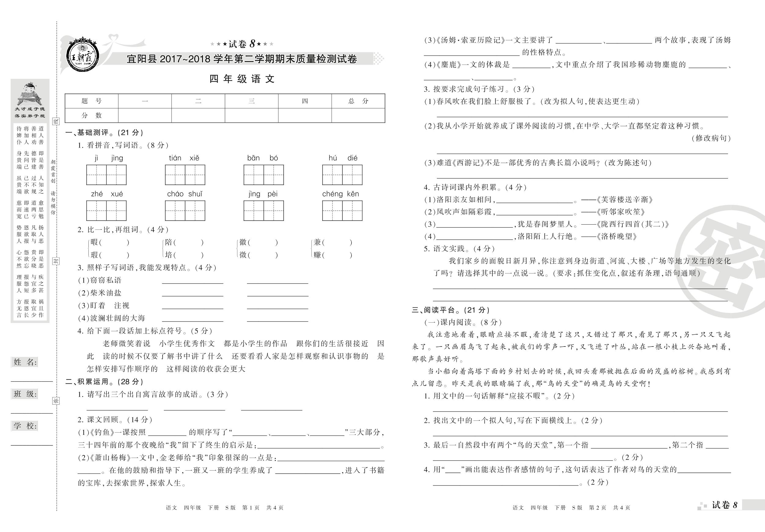 2017-2018学年第二学期洛阳市宜阳县四年级语文试卷(S版)【8】