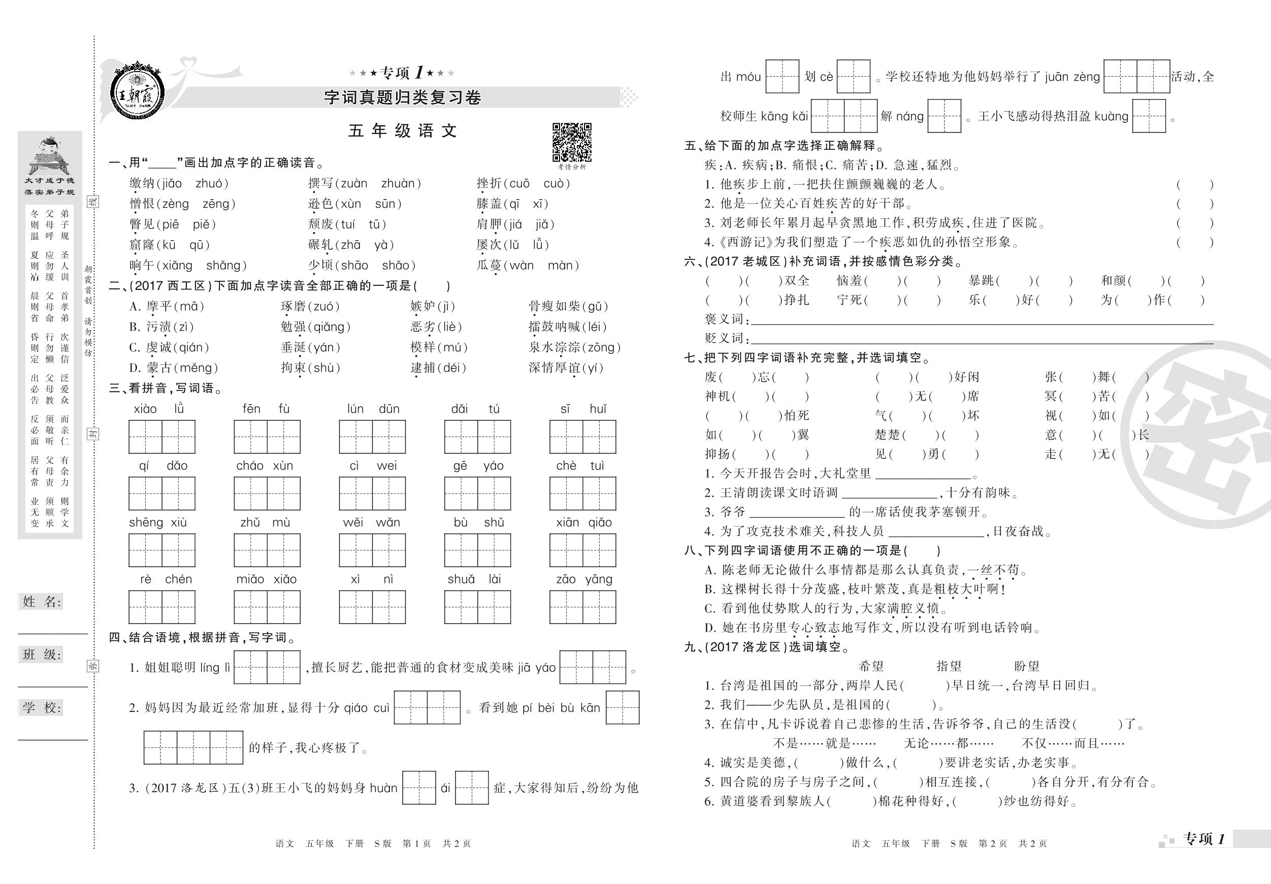 王朝霞期末专项卷——字词、句子真题归类复习五年级下册语文(S版)【0】