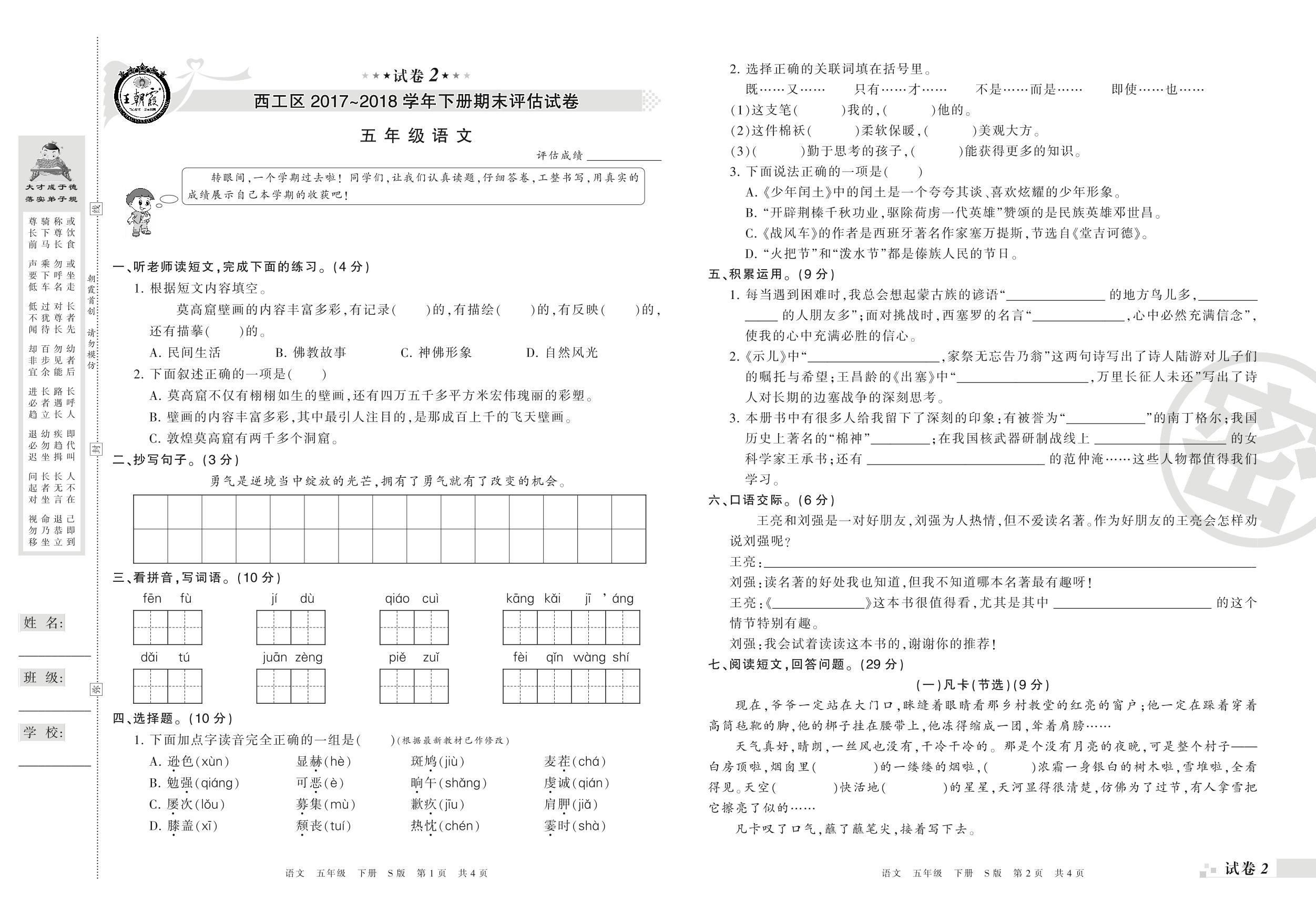 2017-2018学年第二学期洛阳市西工区五年级语文试卷(S版)【2】
