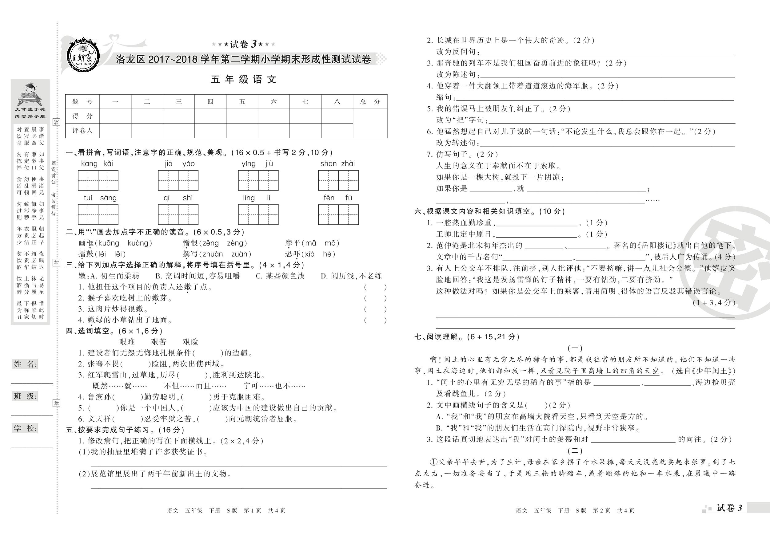 2017-2018学年第二学期洛阳市洛龙区五年级语文试卷(S版)【3】