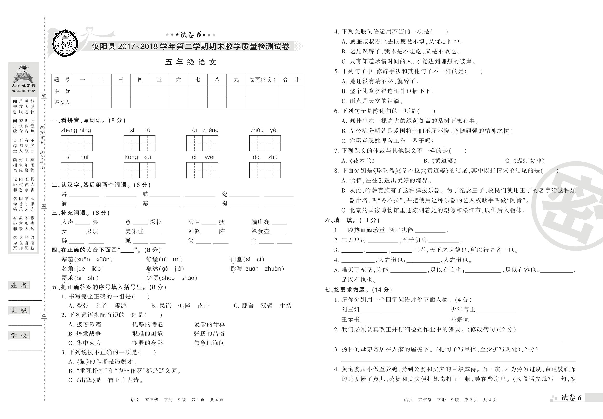 2017-2018学年第二学期洛阳市汝阳县五年级语文试卷(S版)【6】