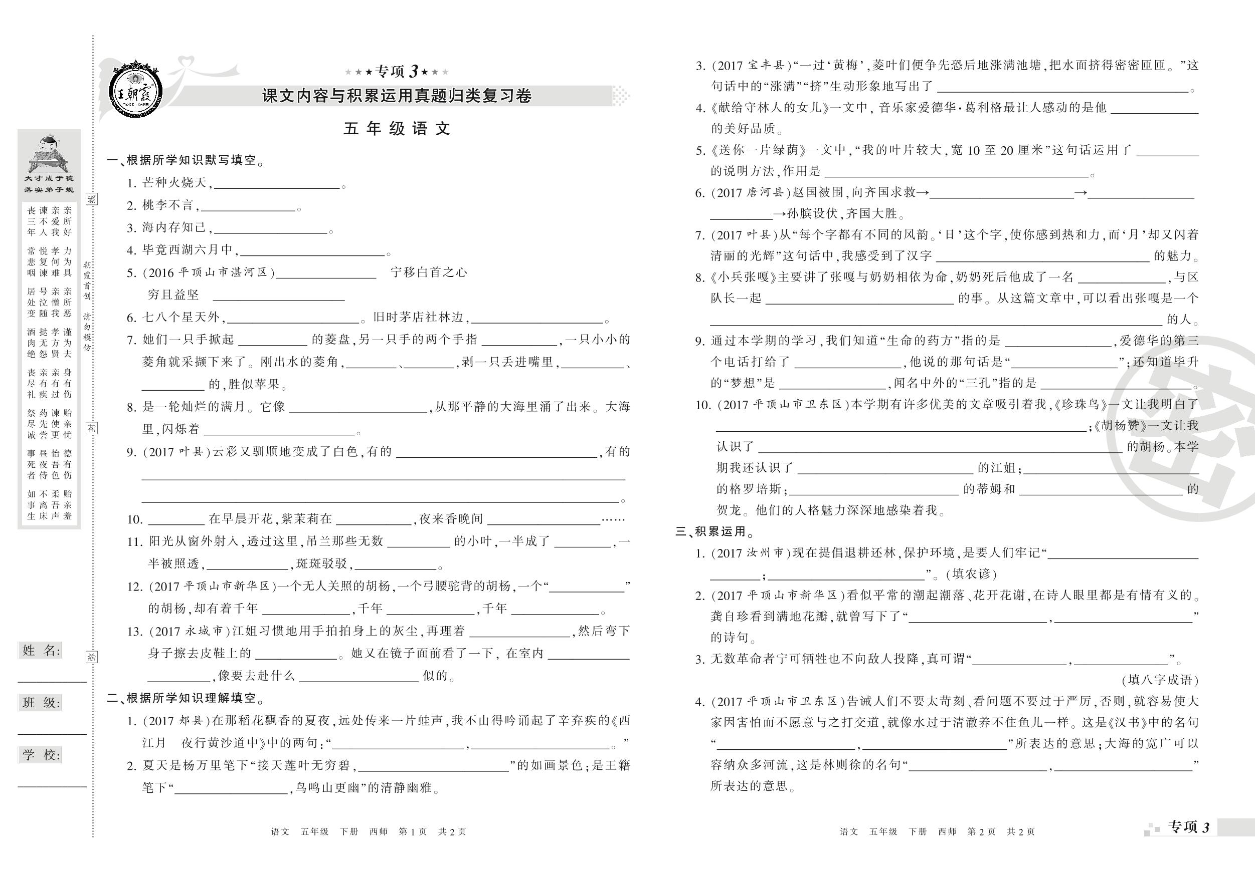 王朝霞期末专项卷——课文内容与积累运用、课内阅读与写作真题归类复习五年级下册语文(西师版)【0】