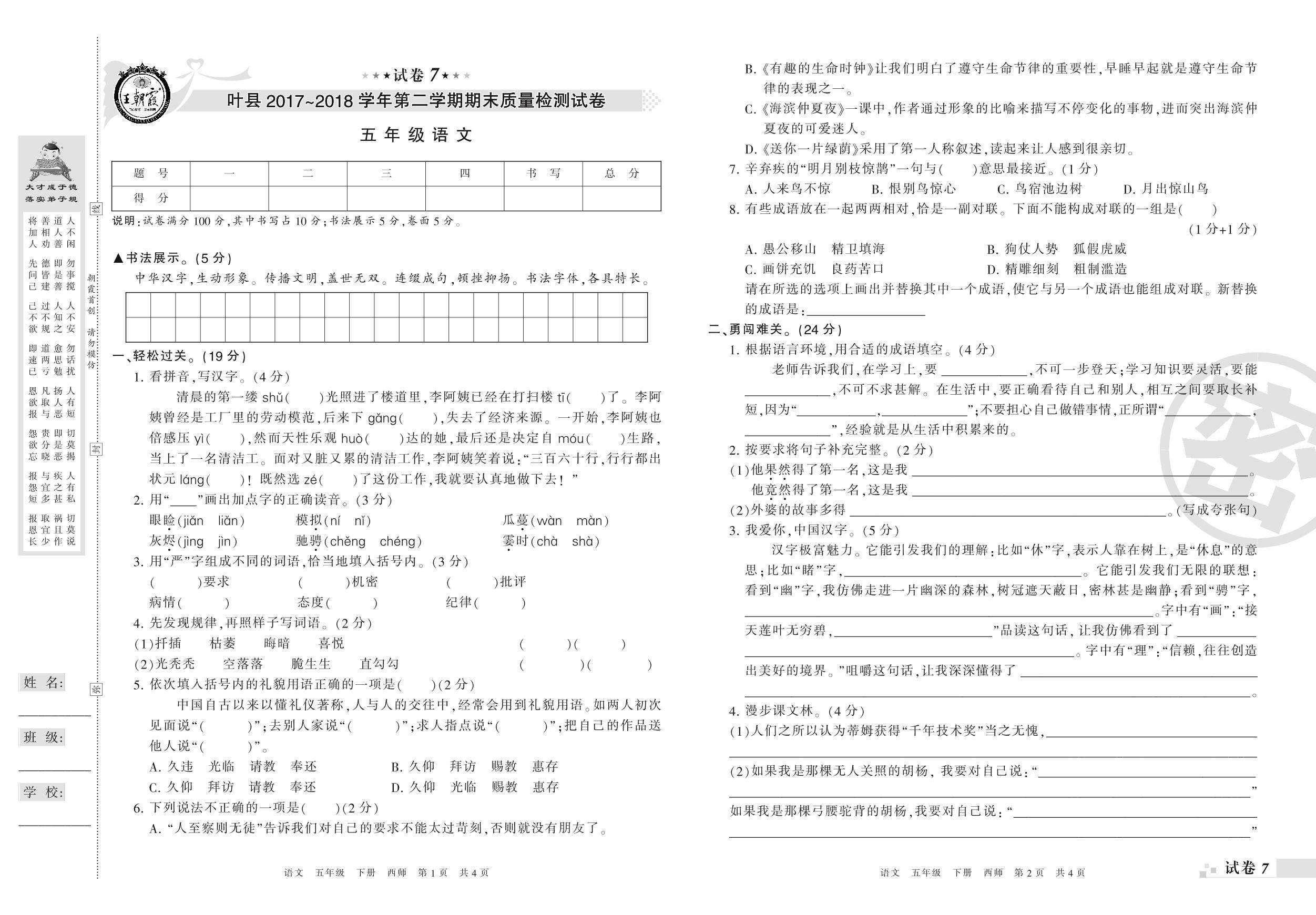 2017-2018学年第二学期平顶山市叶县五年级语文试卷(西师版)【7】