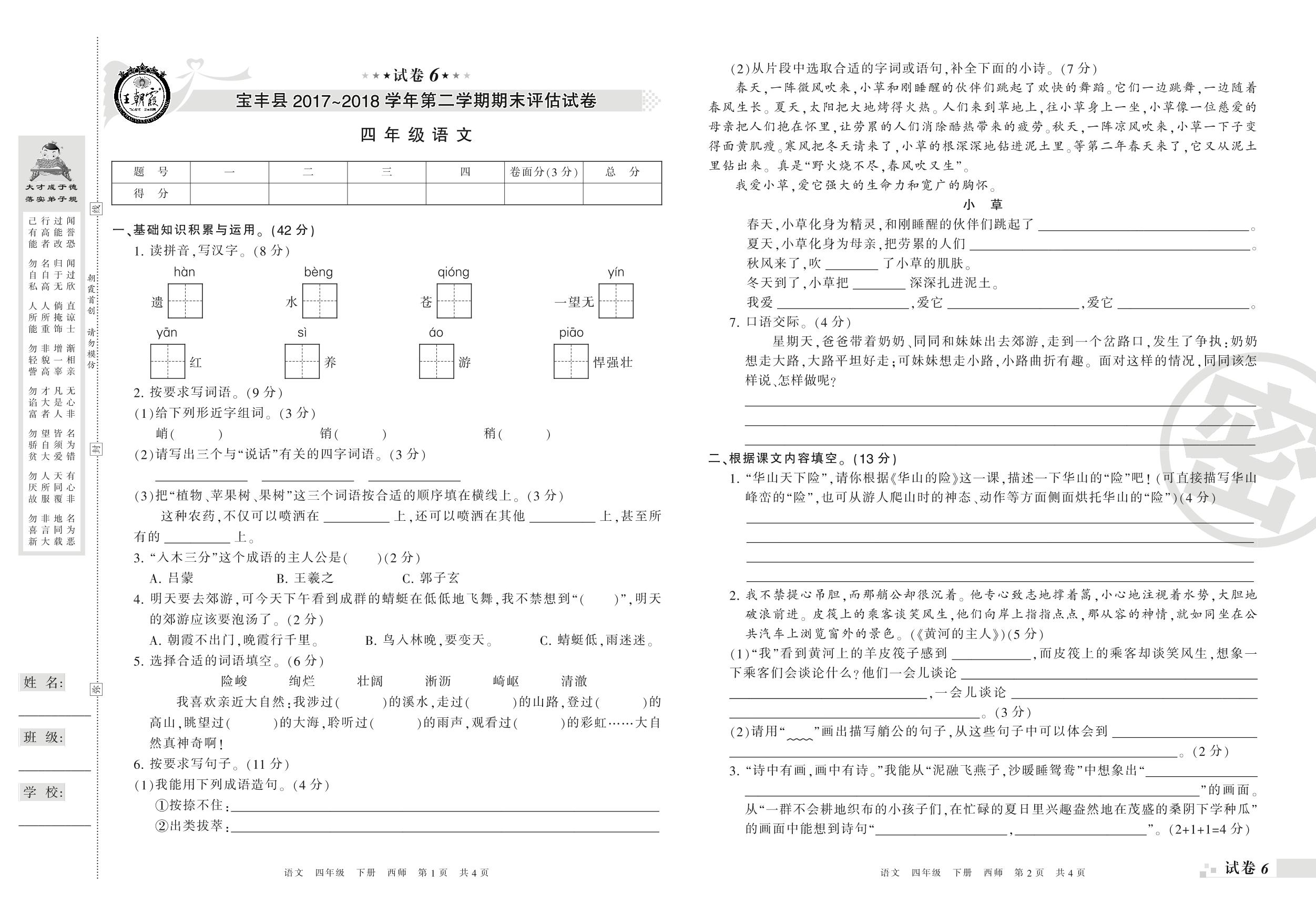 2017-2018学年第二学期平顶山市宝丰县四年级语文试卷(西师版)【6】