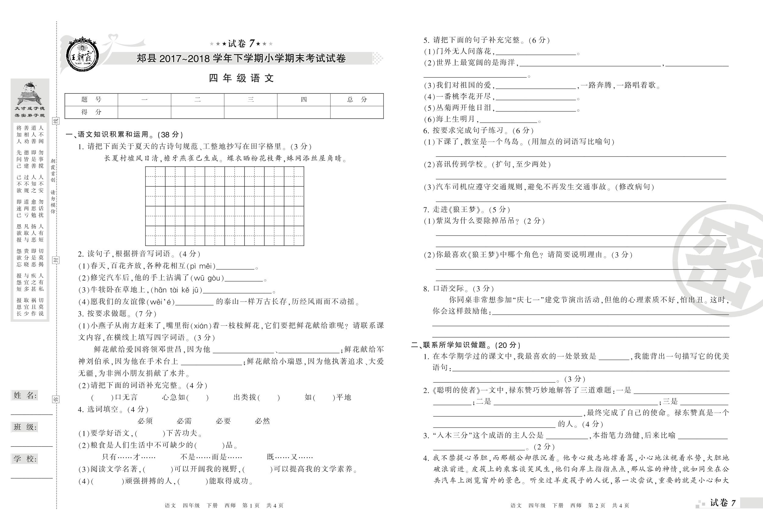 2017-2018学年第二学期平顶山市郏县四年级语文试卷(西师版)【7】
