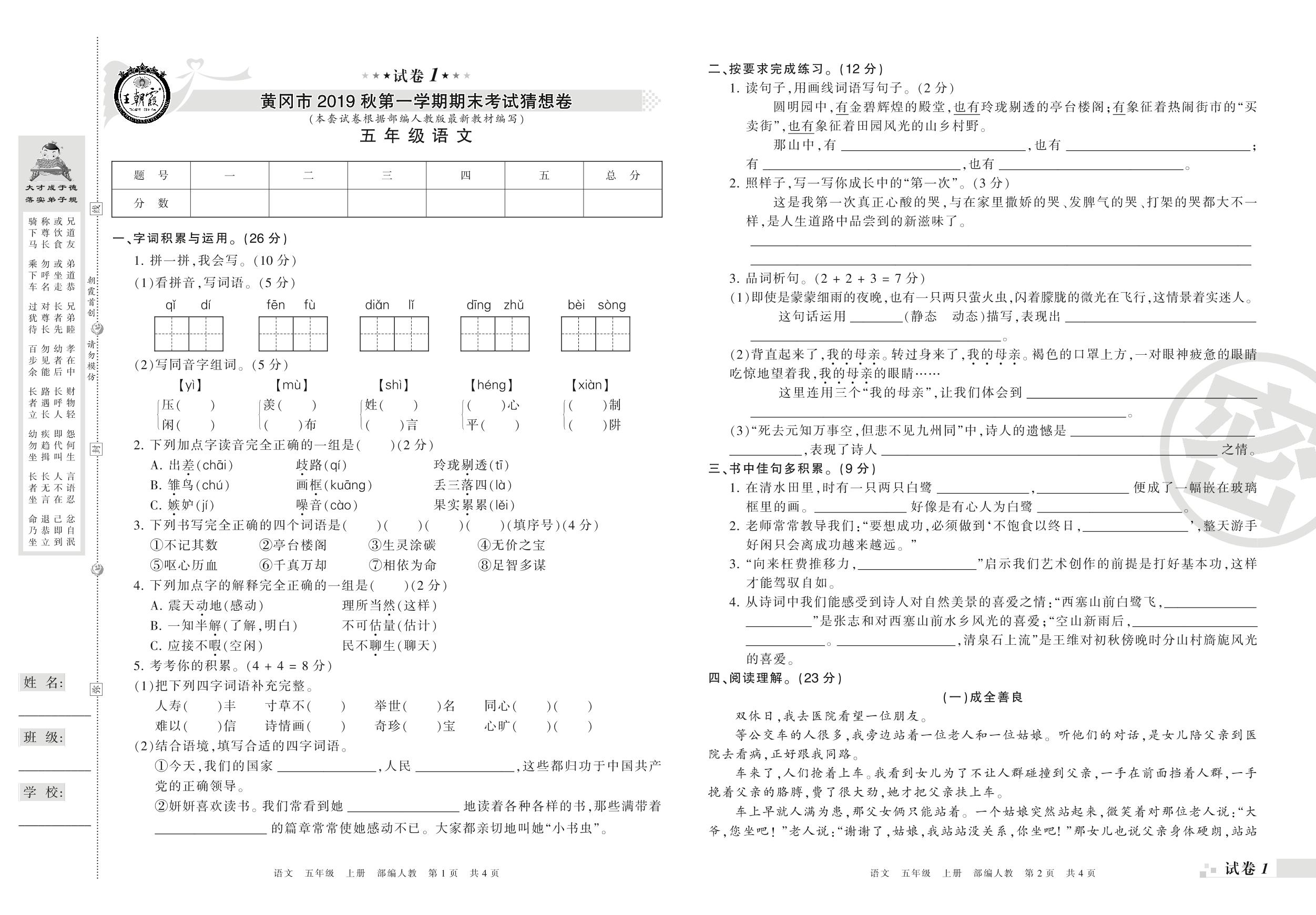 2018-2019学年第一学期黄冈市猜想卷五年级语文试卷(人教版)【1】