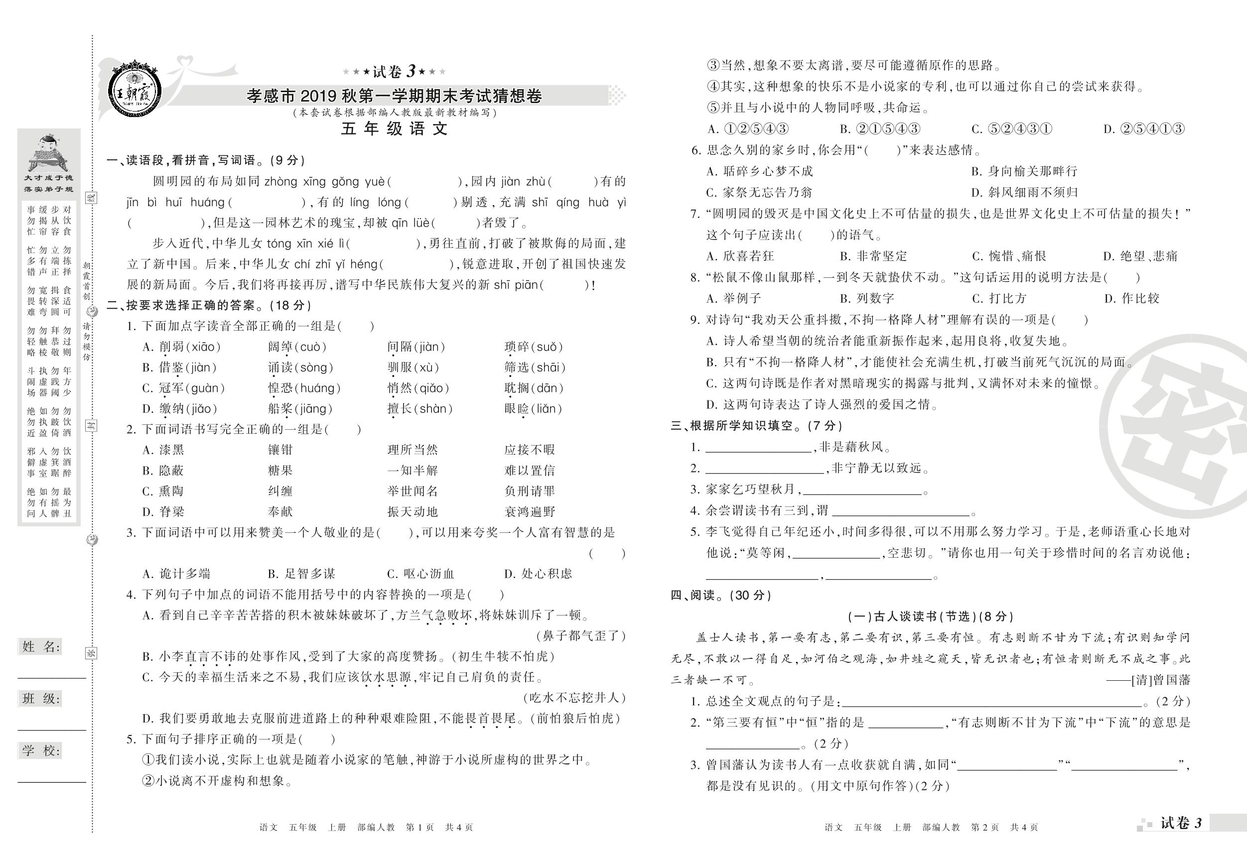 2018-2019学年第一学期孝感市猜想卷五年级语文试卷(人教版)【3】