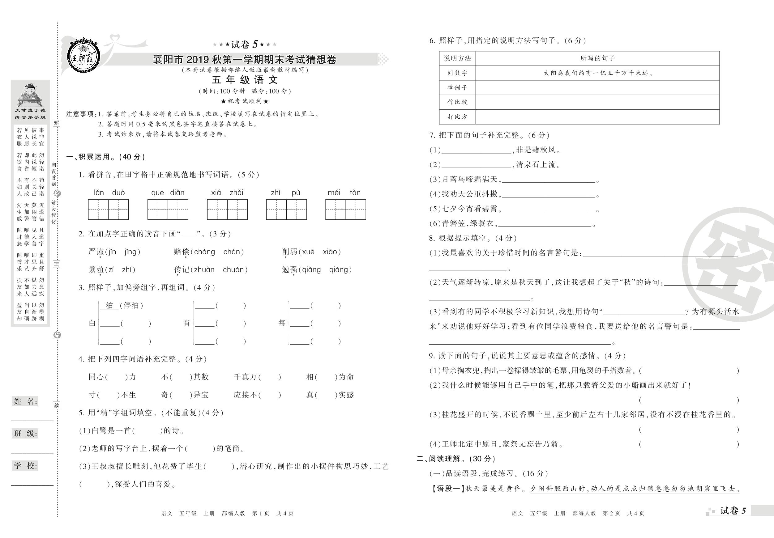 2018-2019学年第一学期襄阳市猜想卷五年级语文试卷(人教版)【5】
