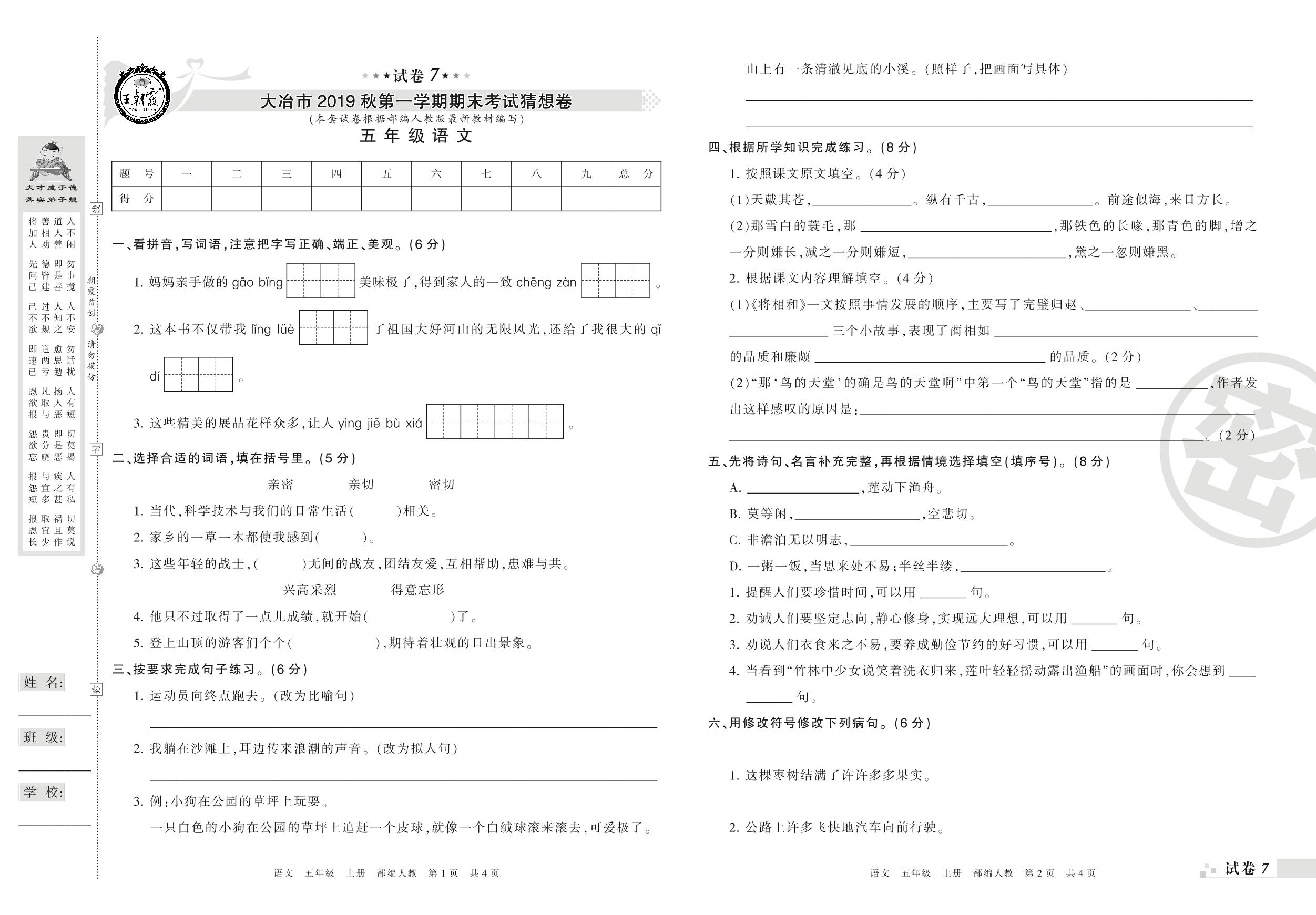 2018-2019学年第一学期大冶市猜想卷五年级语文试卷(人教版)【7】