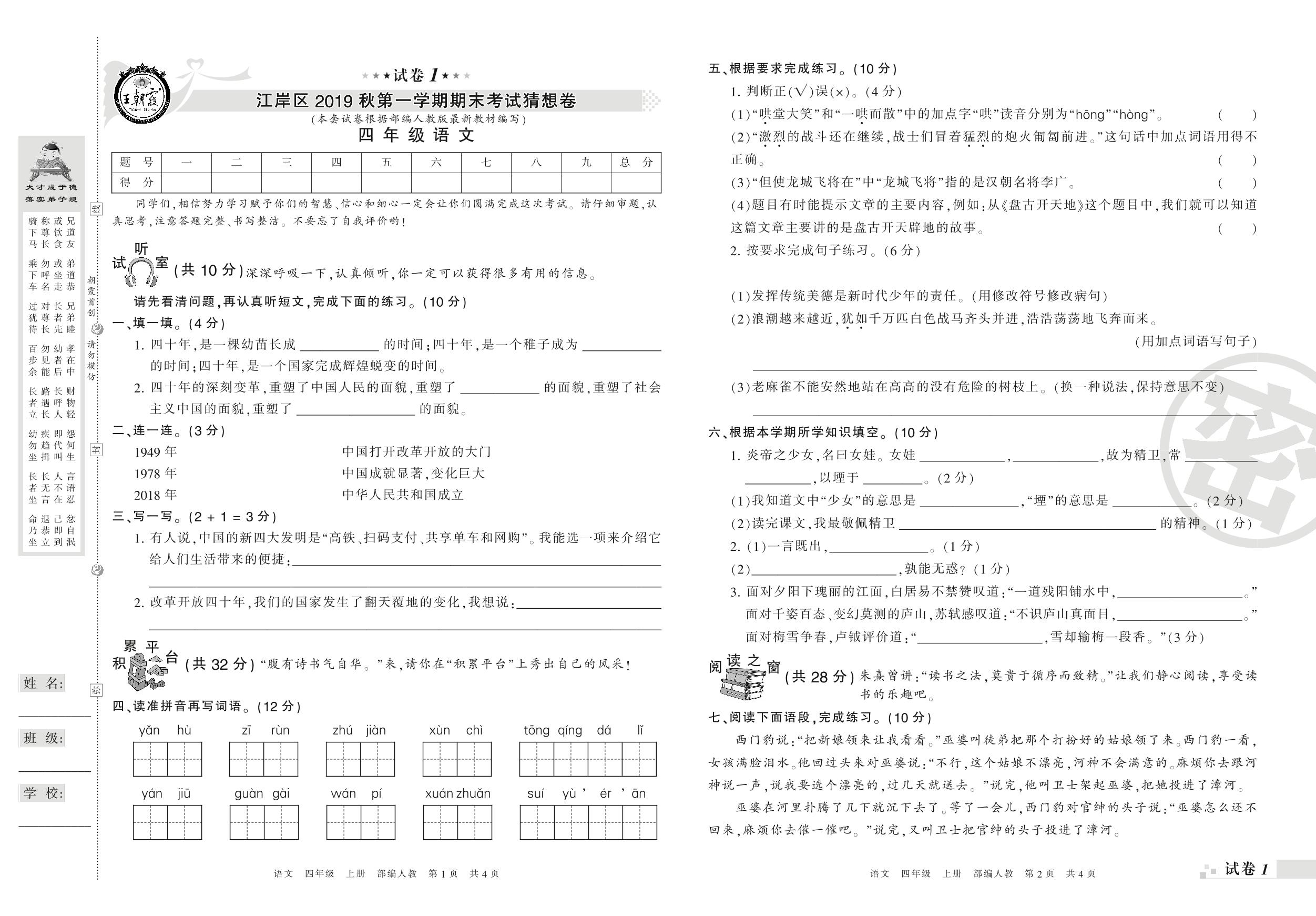 2018-2019学年第一学期武汉市江岸区猜想卷四年级语文试卷(人教版)【1】