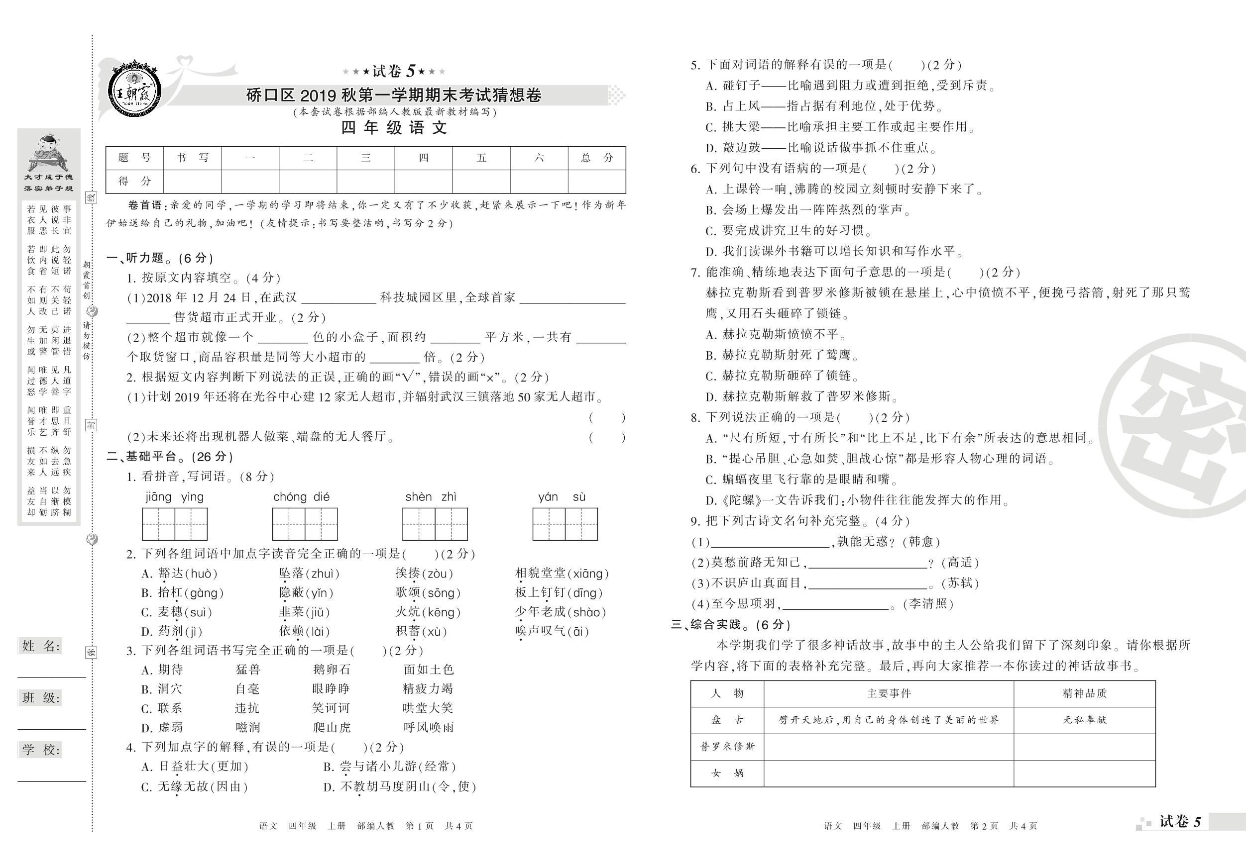 2018-2019学年第一学期武汉市硚口区猜想卷四年级语文试卷(人教版)【5】