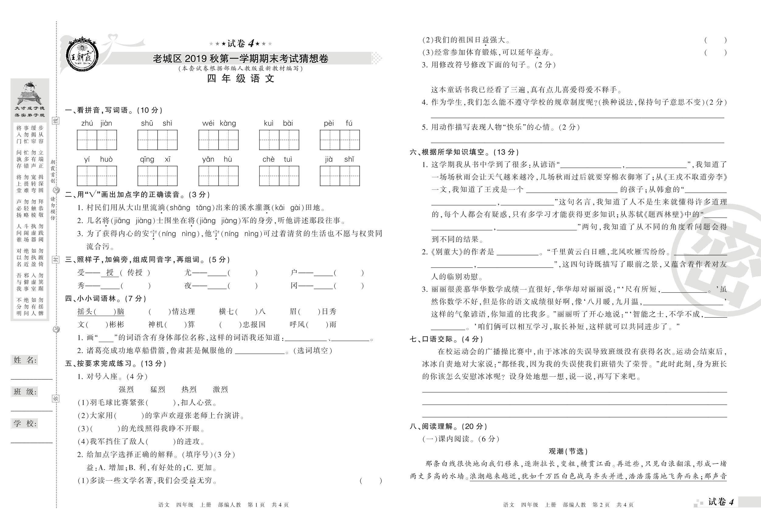 2018-2019学年第一学期洛阳市老城区猜想卷四年级语文试卷(人教版)【4】