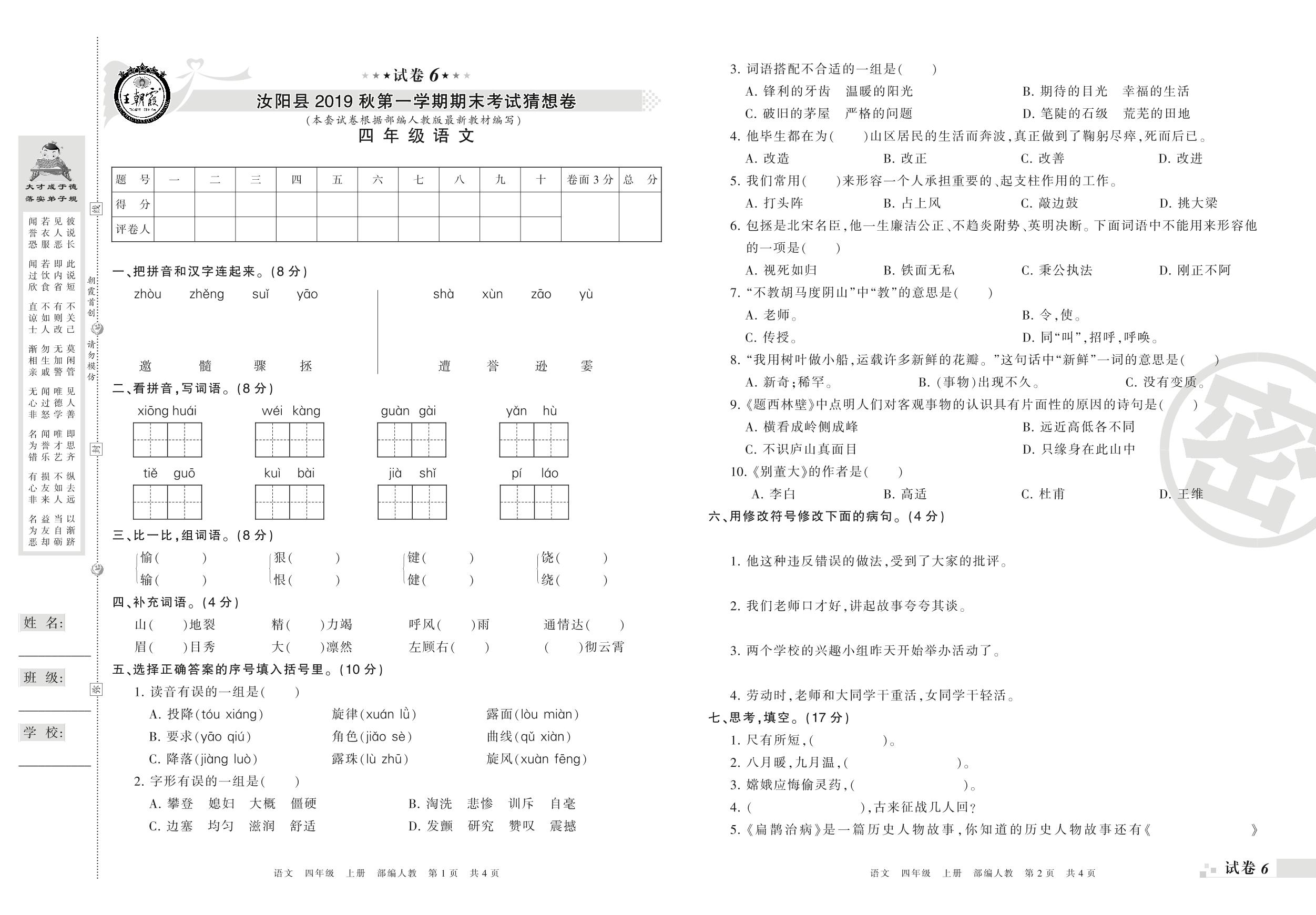 2018-2019学年第一学期洛阳市汝阳县猜想卷四年级语文试卷(人教版)【6】