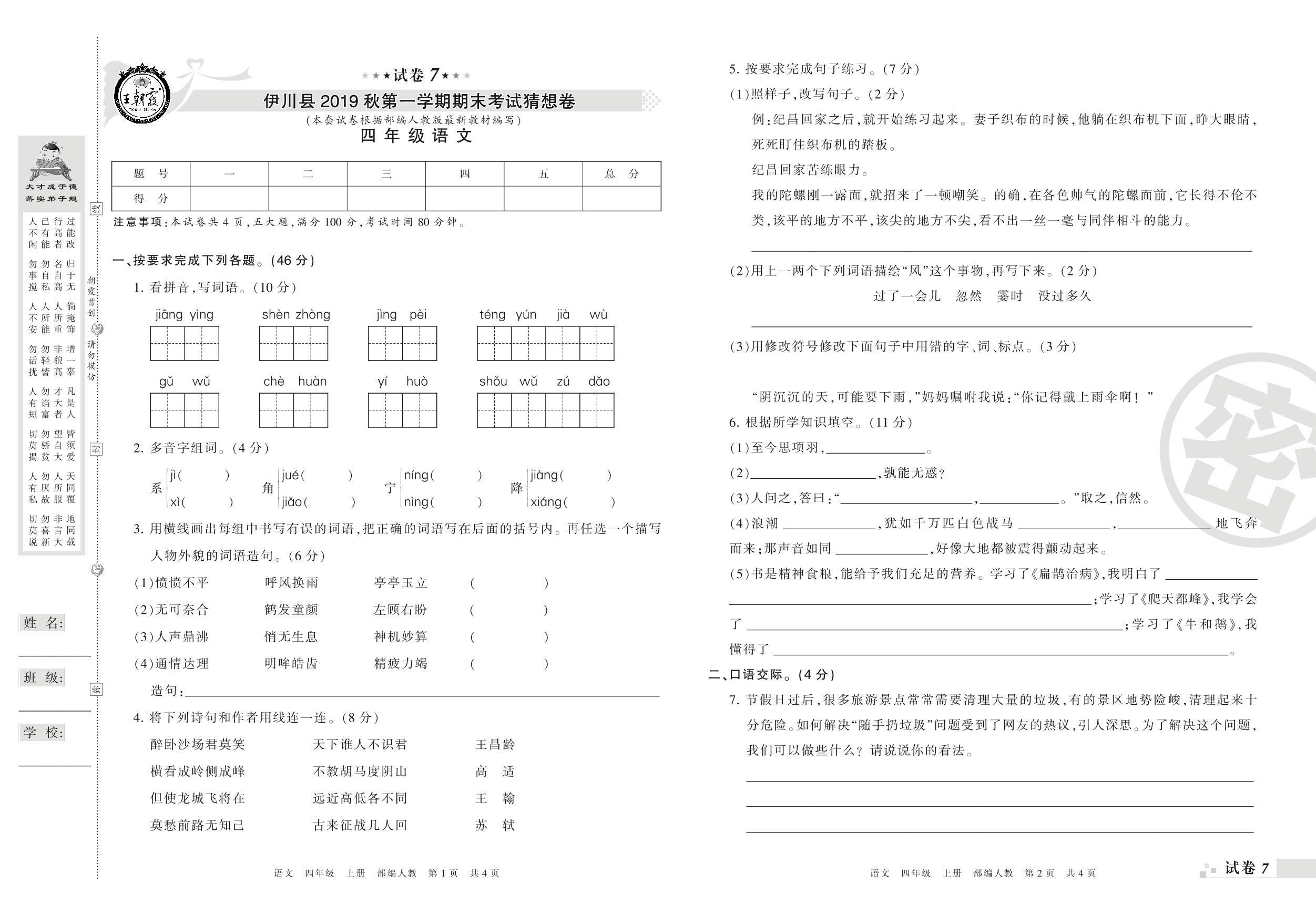 2018-2019学年第一学期洛阳市 伊川县猜想卷四年级语文试卷(人教版)【7】