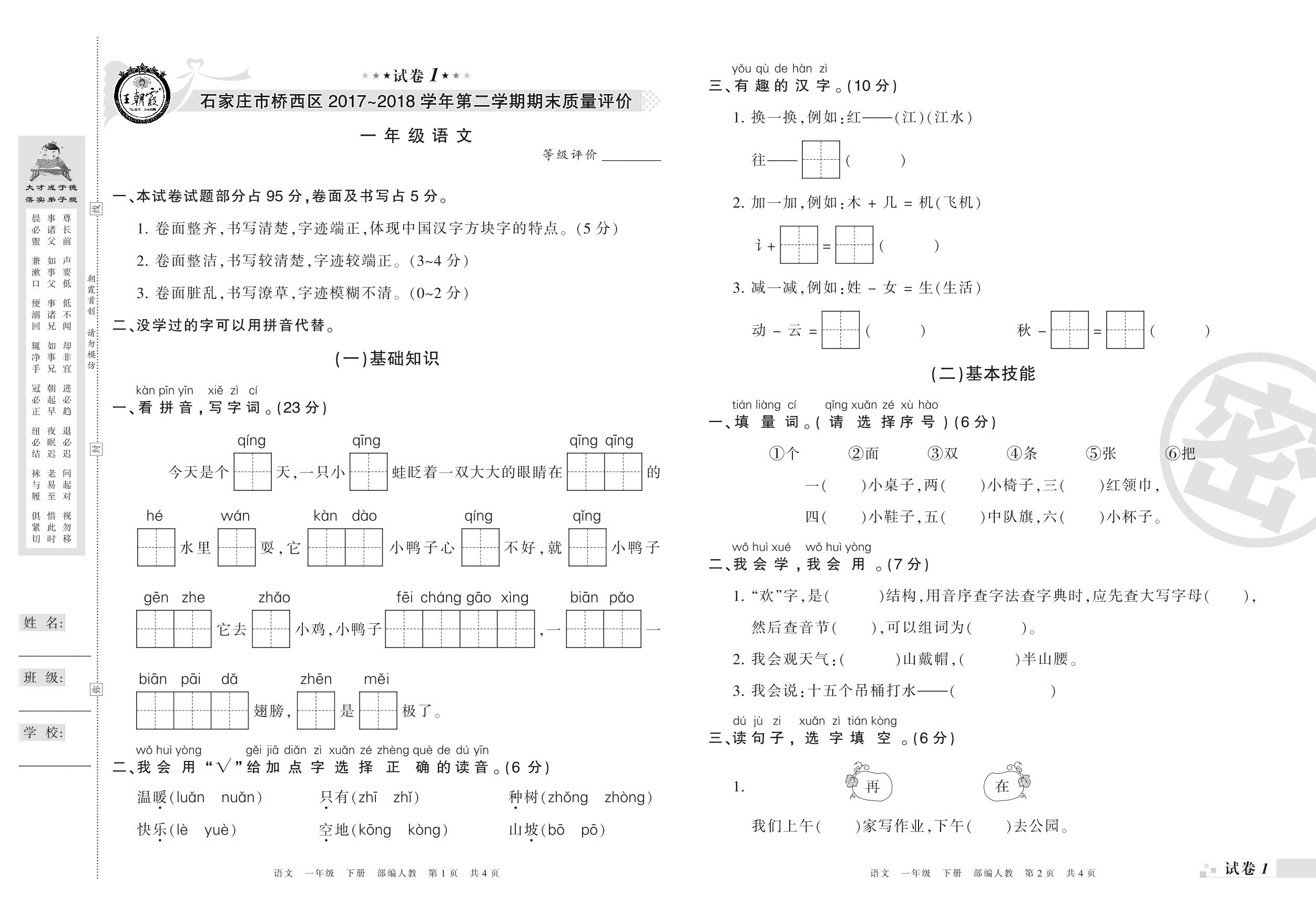 2017-2018学年第二学期石家庄市桥西区一年级语文试卷(人教版)【1】