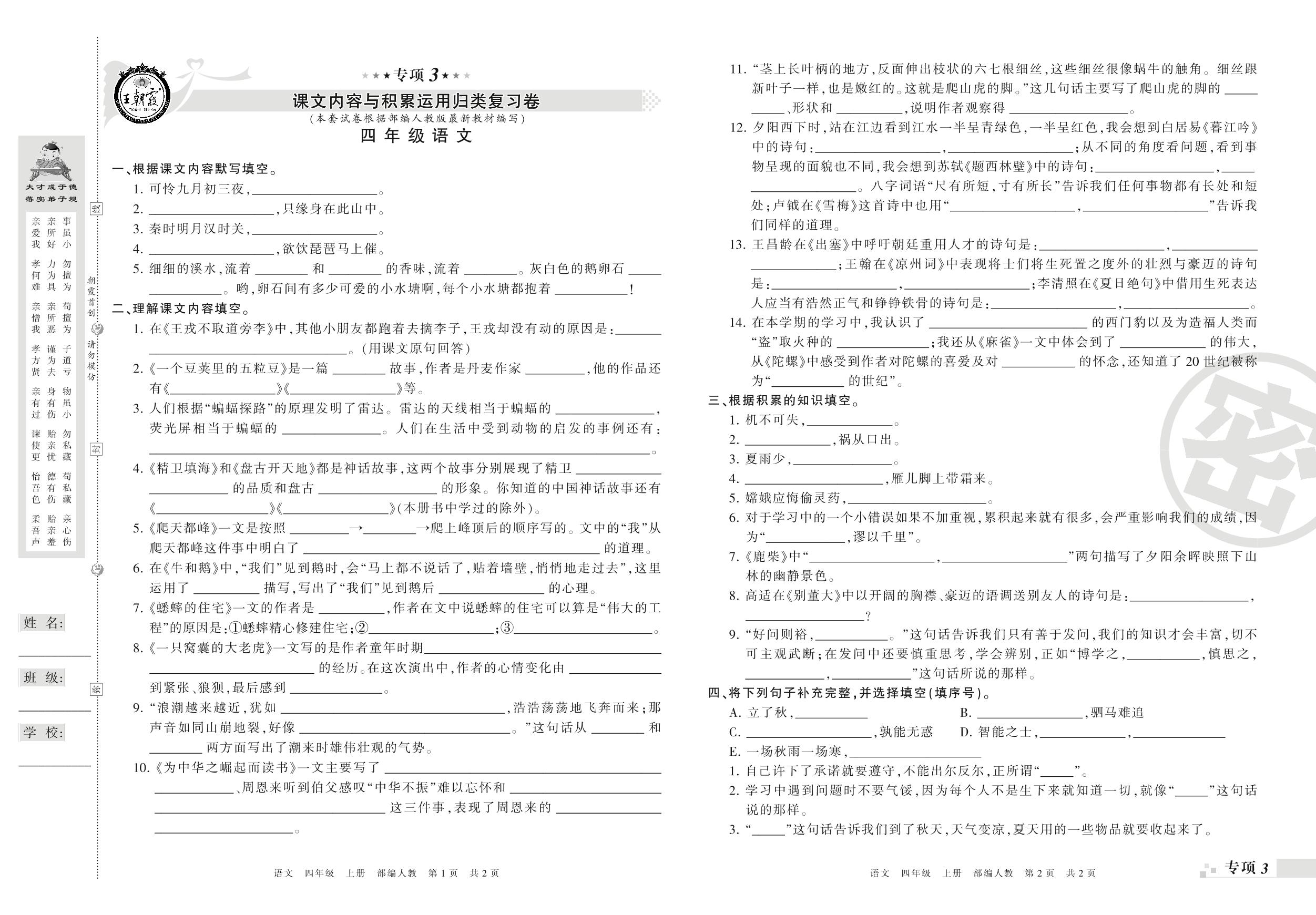 王朝霞期末专项卷——课文内容与积累运用、课内阅读与写作真题归类复习卷四年级上册语文(人教版)_R210801195058【0】