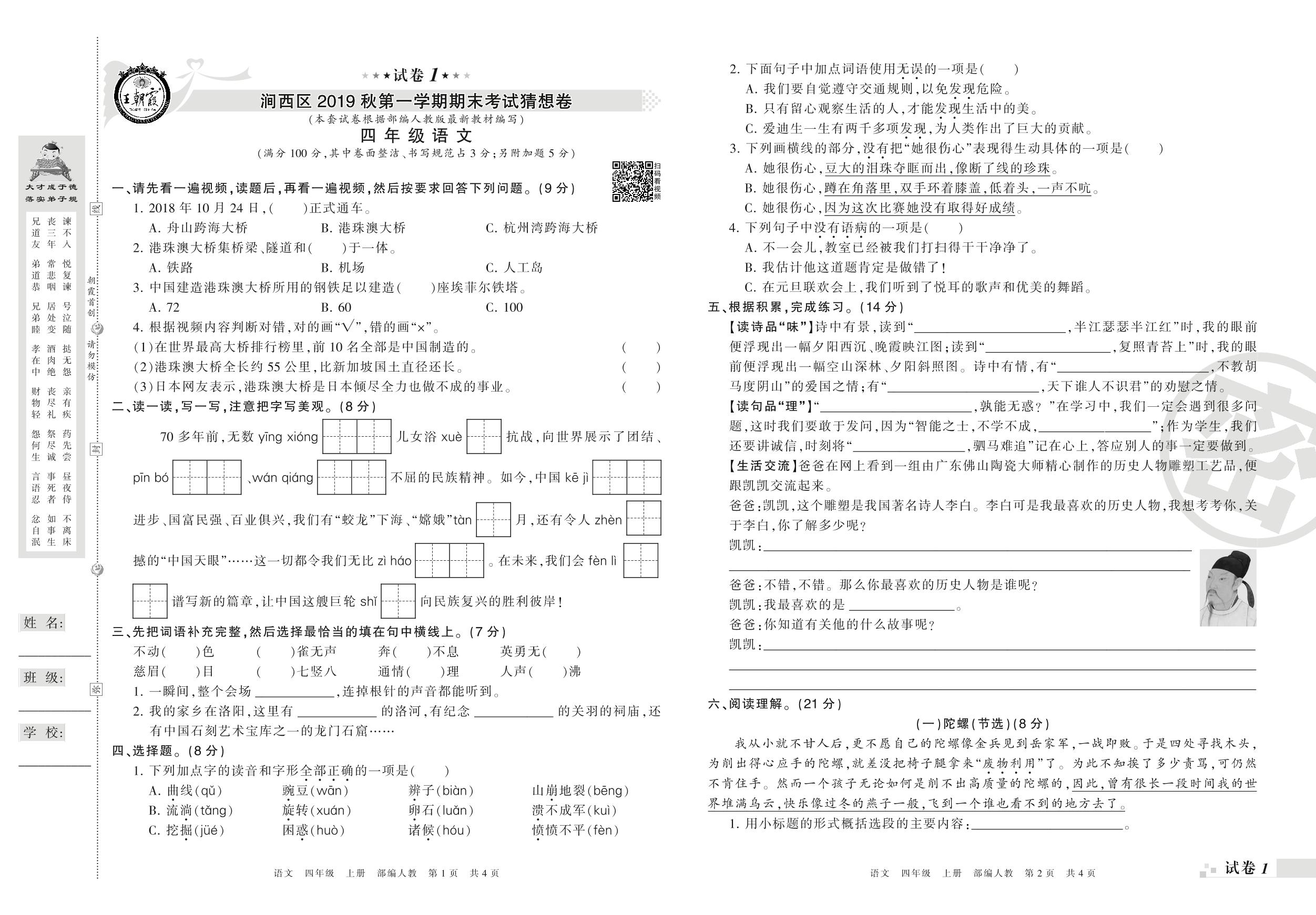 2018-2019学年第一学期洛阳市涧西区猜想卷四年级语文试卷(人教版)【1】