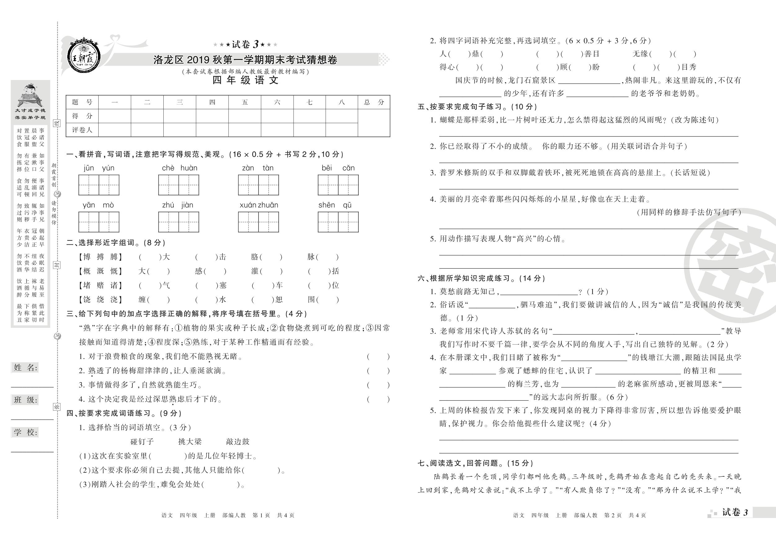 2018-2019学年第一学期洛阳市洛龙区猜想卷四年级语文试卷(人教版)【3】
