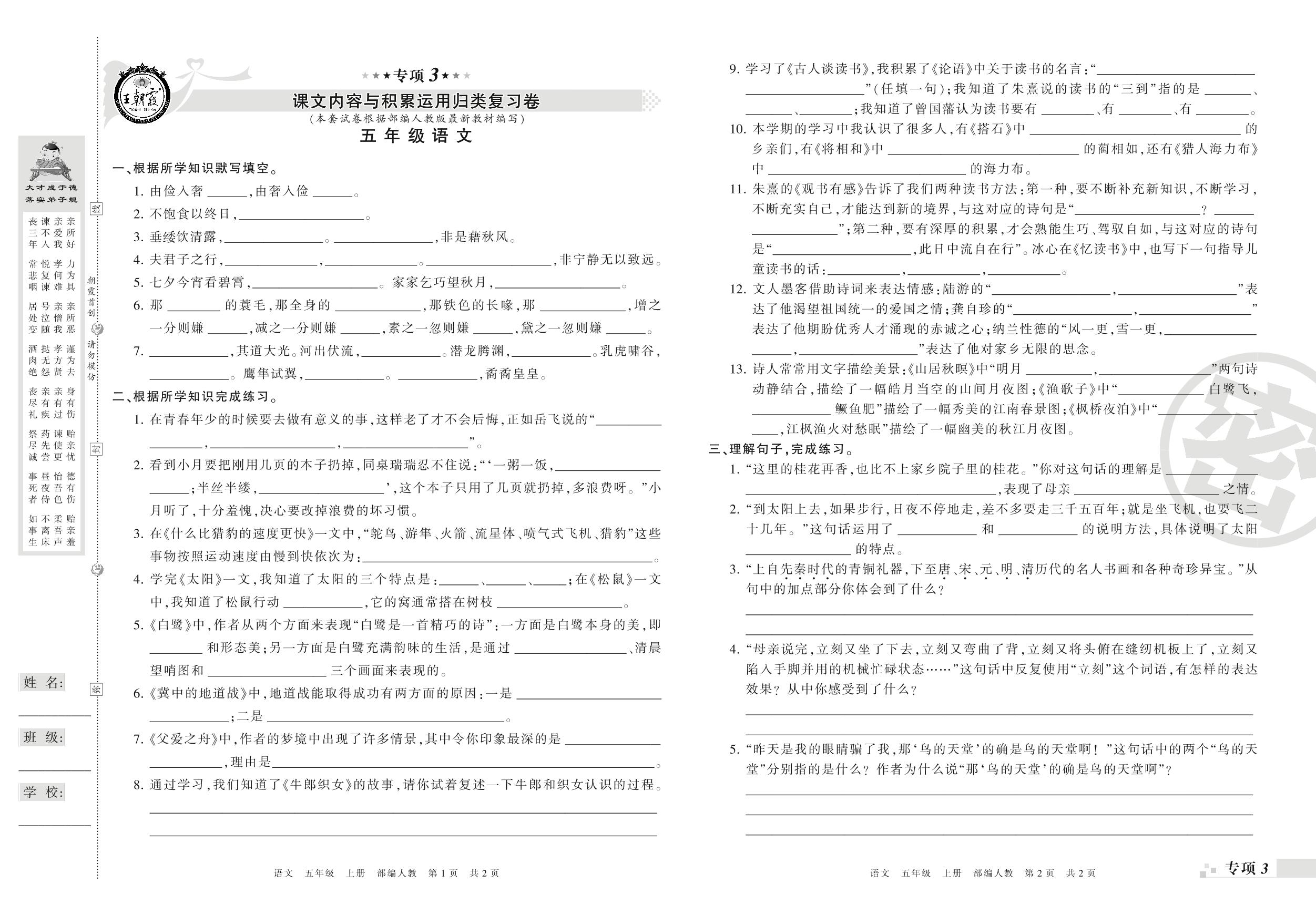 王朝霞期末专项卷——课文内容与积累运用、课内阅读与写作真题归类复习卷五年级上册语文(人教版)_R210801195115【0】