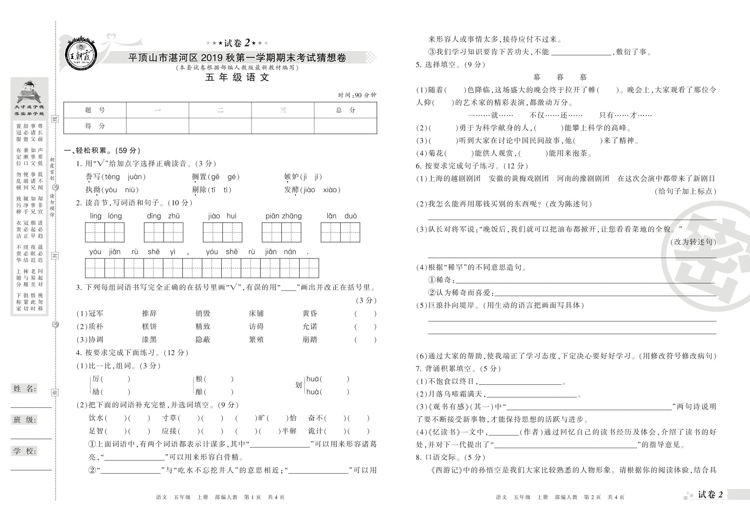 2018-2019学年第一学期平顶山市湛河区猜想卷五年级语文试卷(人教版)【2】