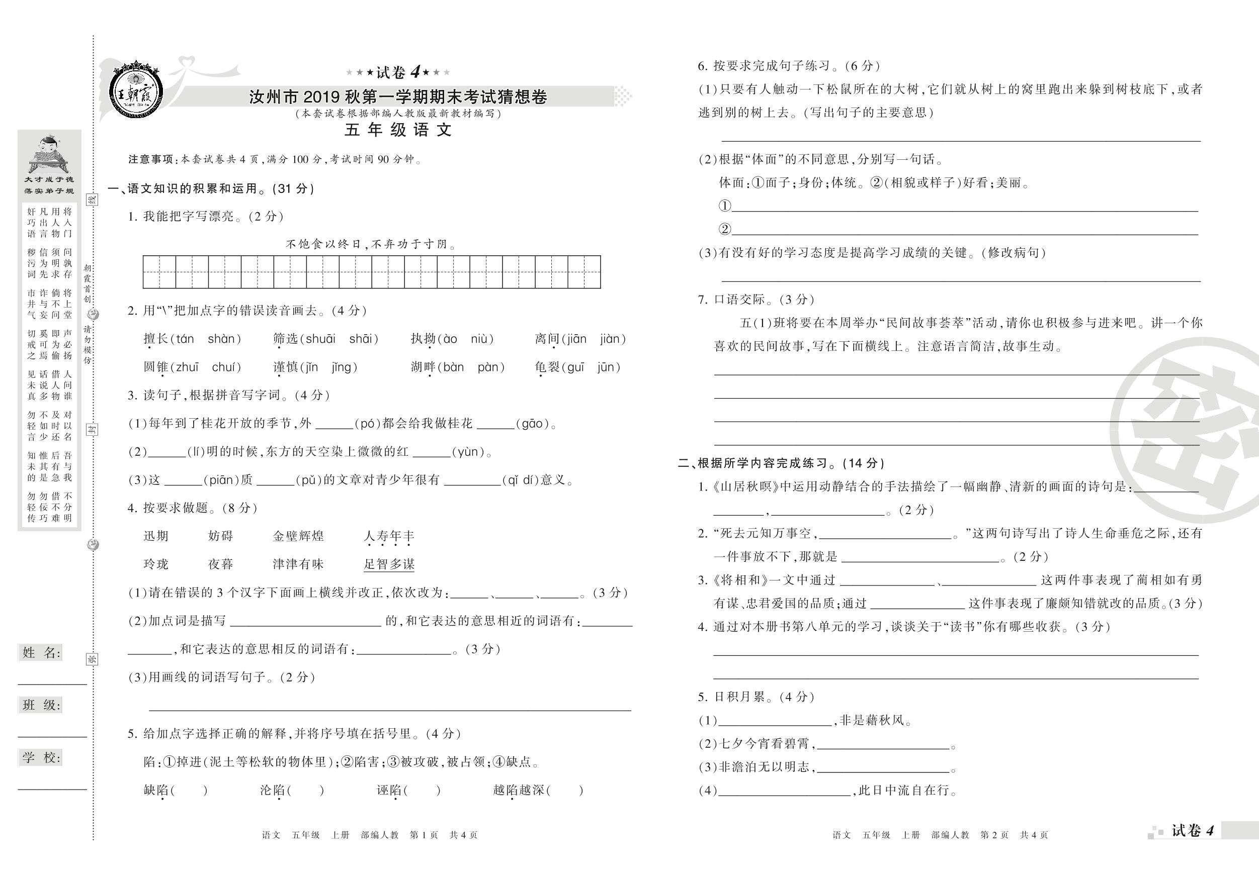 2018-2019学年第一学期汝州市猜想卷五年级语文试卷(人教版)【4】