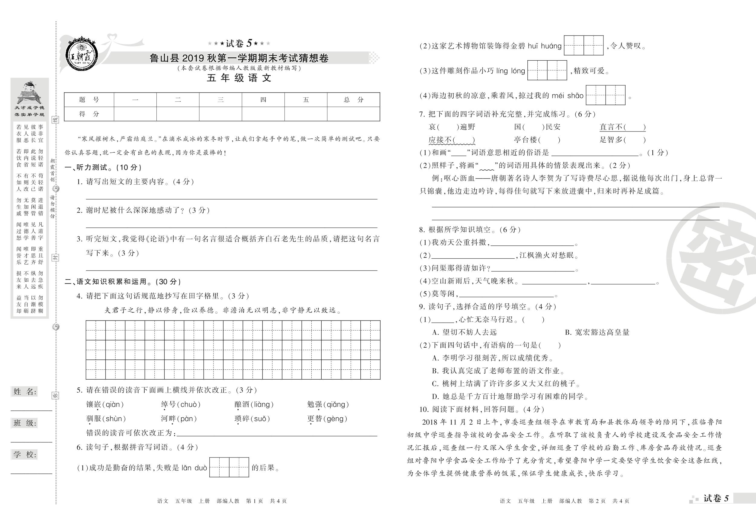 2018-2019学年第一学期平顶山市鲁山县猜想卷五年级语文试卷(人教版)【5】