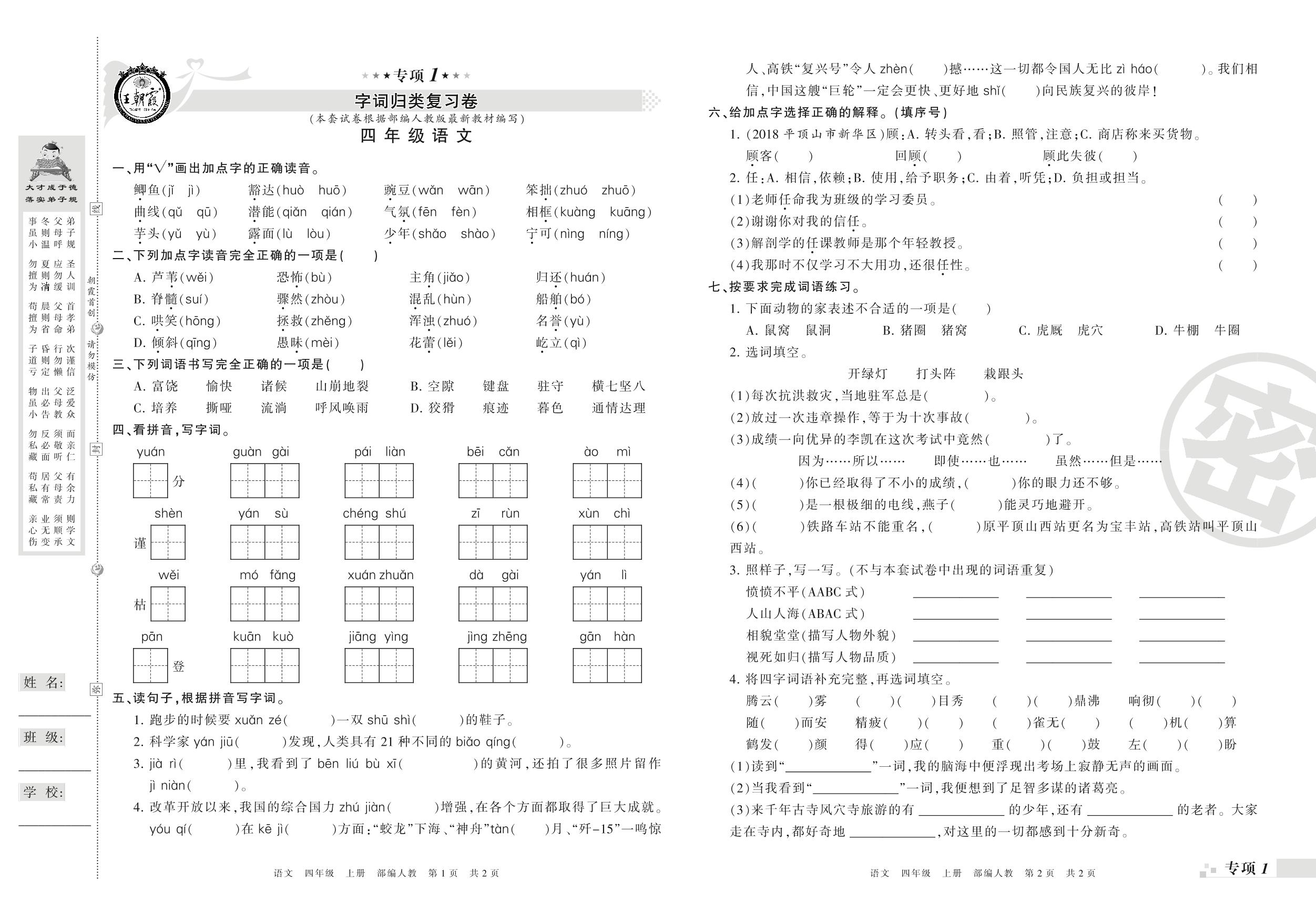 王朝霞期末专项卷——字词、句子与口语交际真题归类复习卷四年级上册语文(人教版)_R210801195207【0】