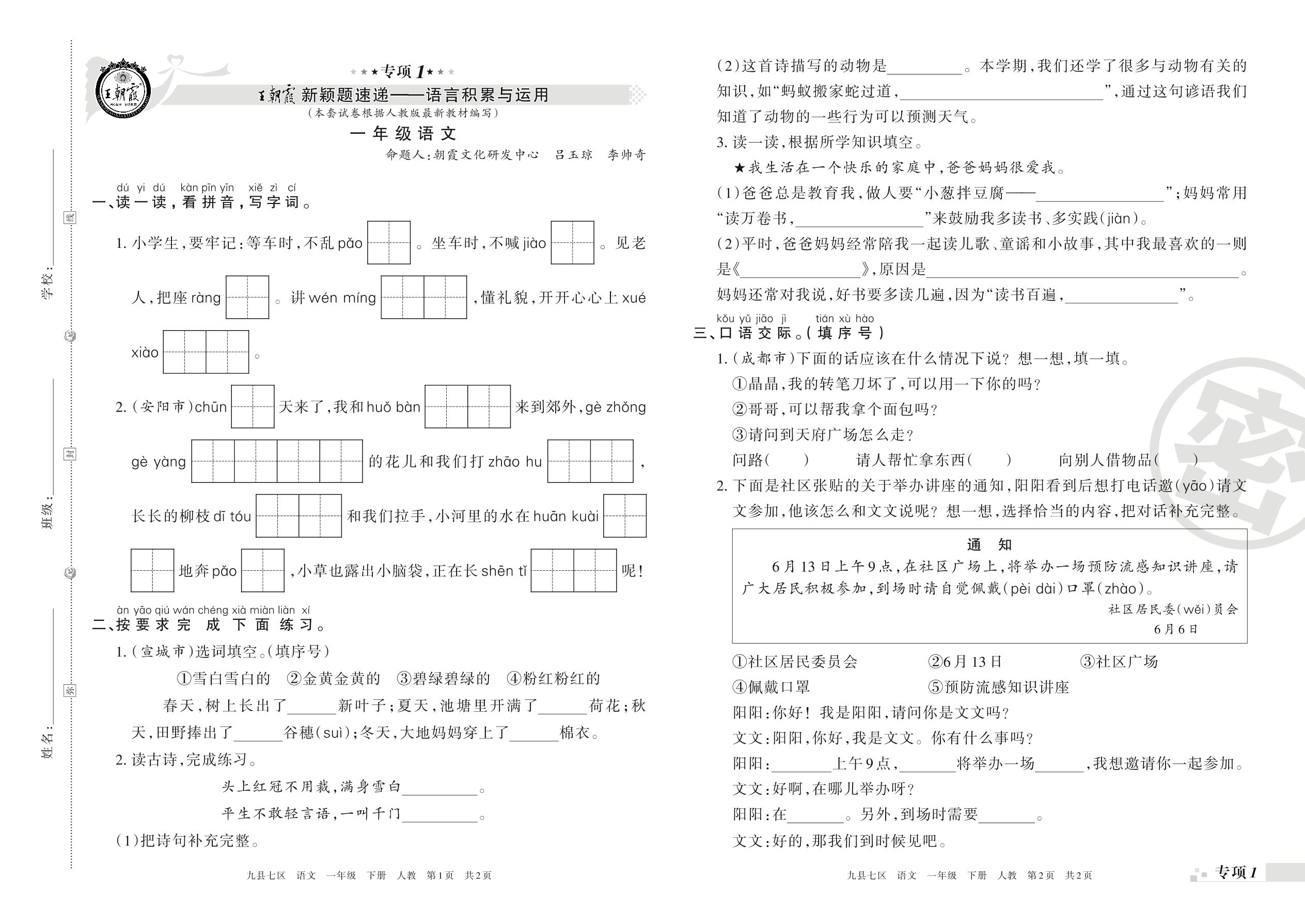 王朝霞期末专项卷——语言积累与运用、句子与口语交际真题归类复习一年级下册语文(人教版)_R210731172920【0】
