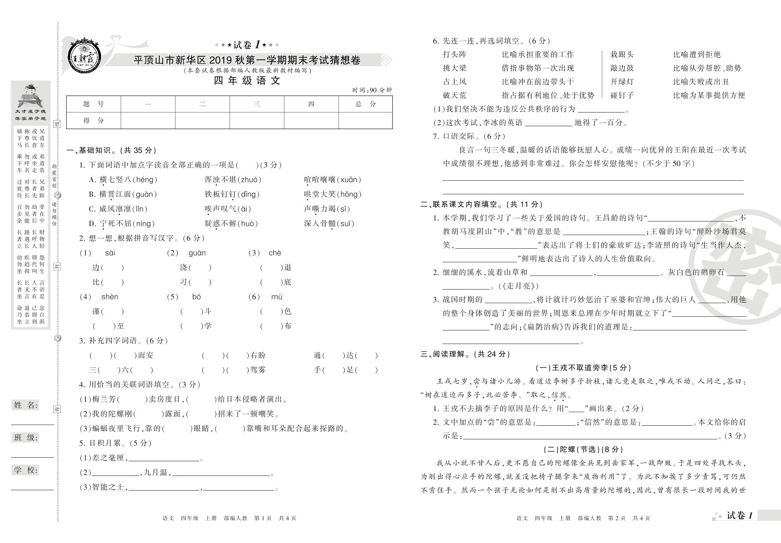 2018-2019学年第一学期平顶山市新华区猜想卷四年级语文试卷(人教版)【1】