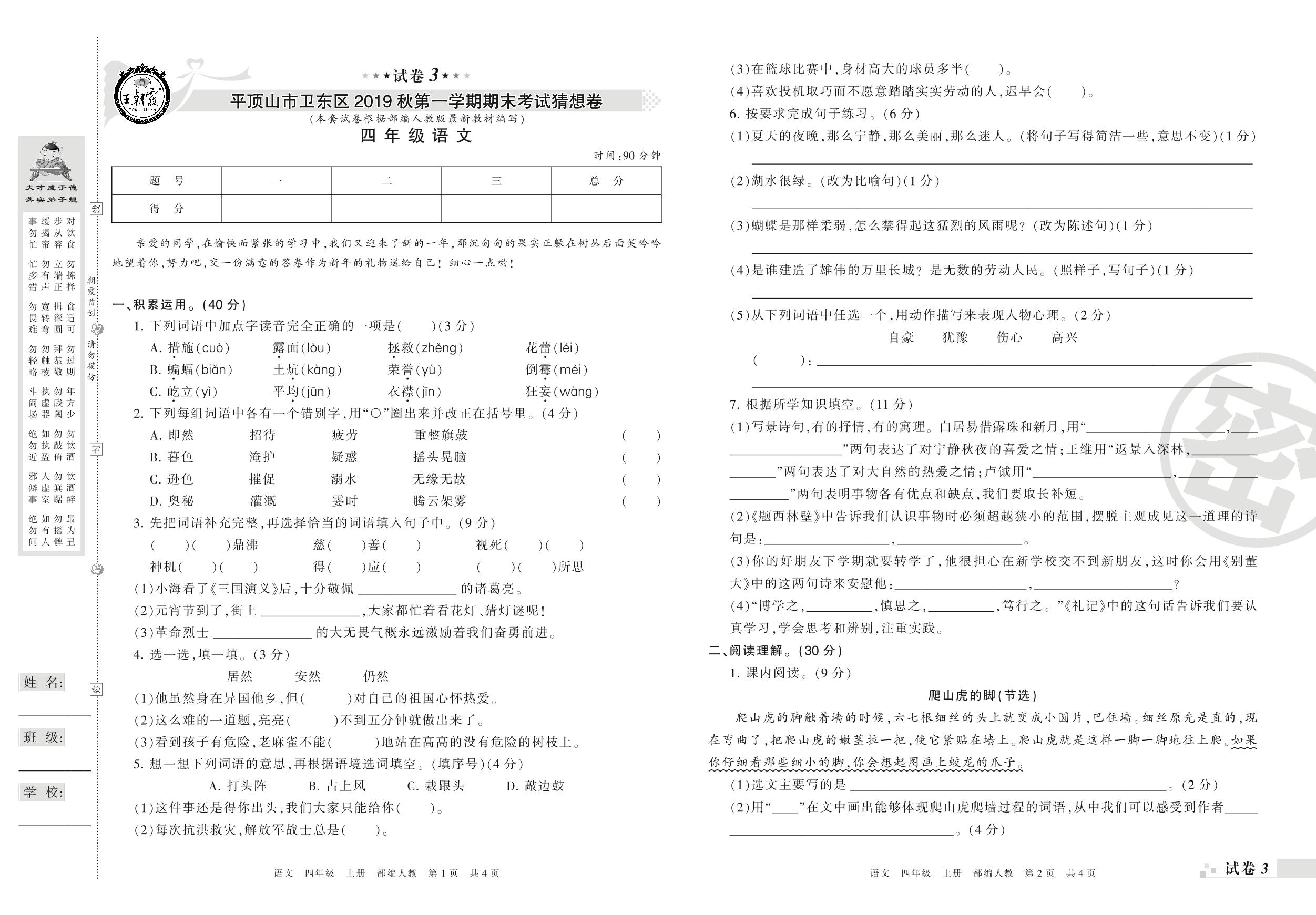 2018-2019学年第一学期平顶山市卫东区猜想卷四年级语文试卷(人教版)【3】
