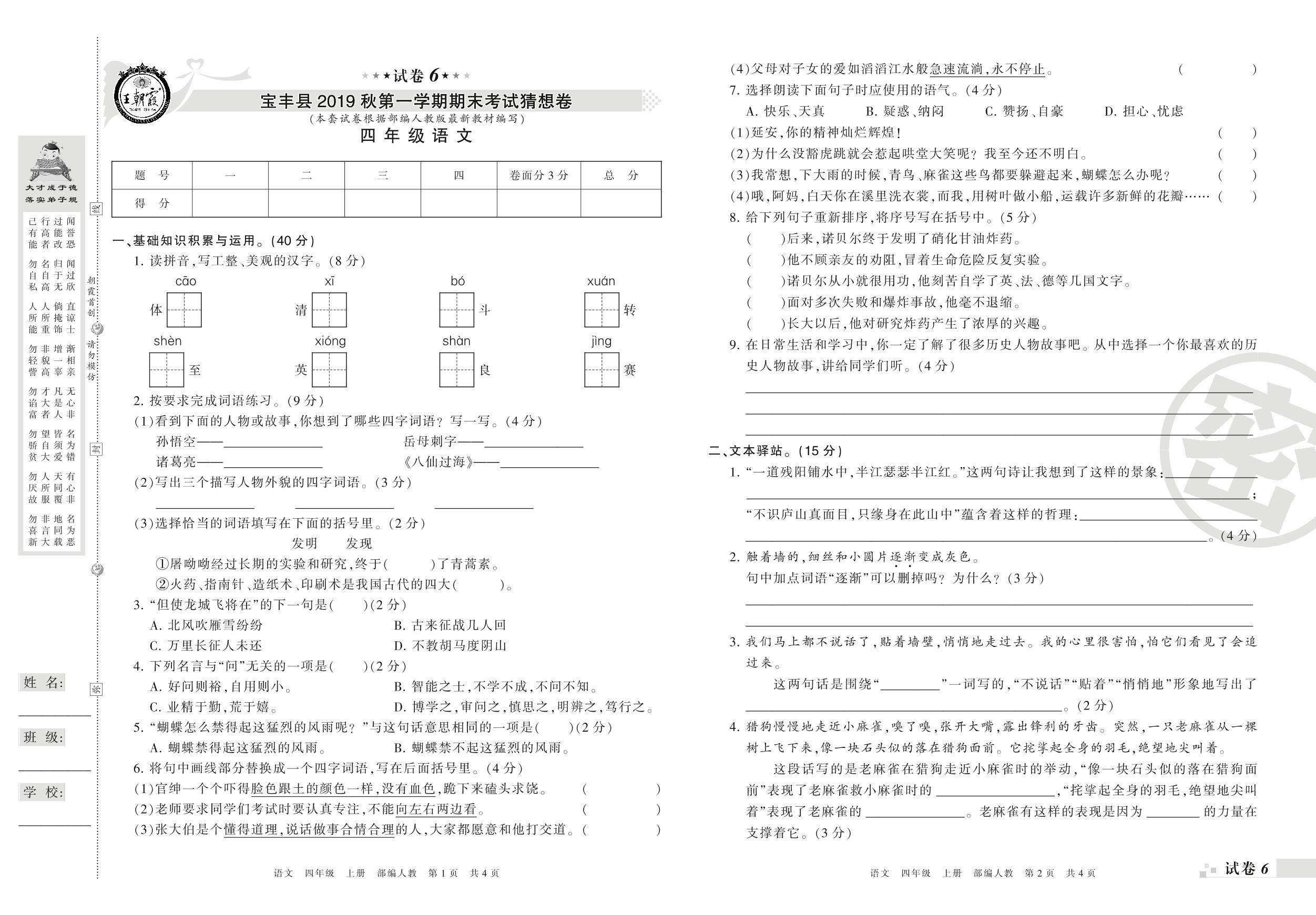 2018-2019学年第一学期平顶山市宝丰县猜想卷四年级语文试卷(人教版)【6】