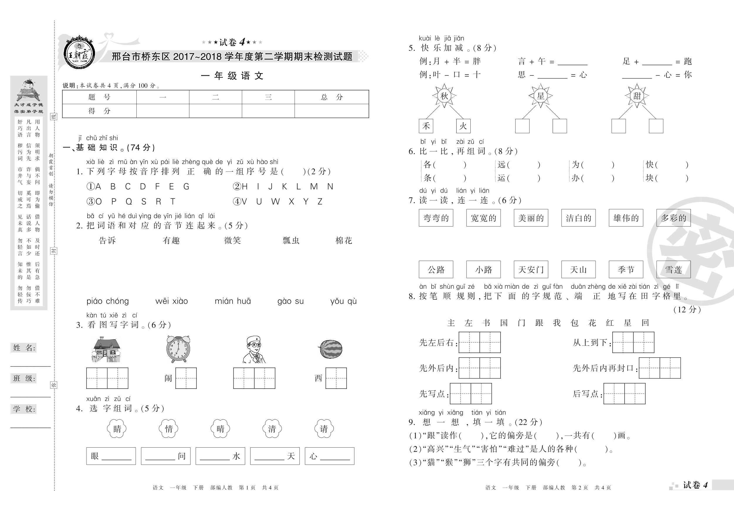 2017-2018学年第二学期邢台市桥东区一年级语文试卷(人教版)【4】