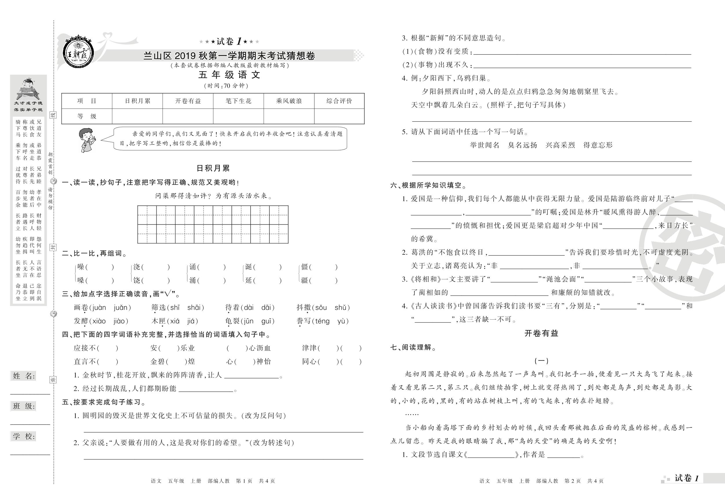 2018-2019学年第一学期临沂市兰山区猜想卷五年级语文试卷(人教版)【1】