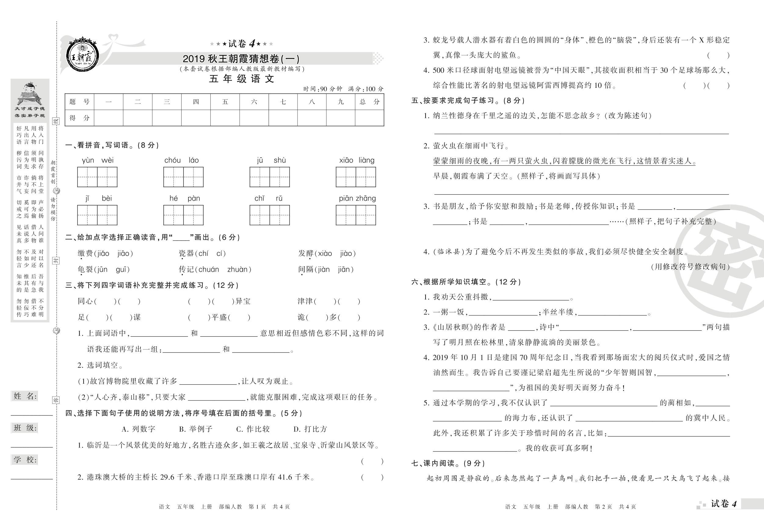 王朝霞期末猜想卷(一)五年级上册语文(人教版)【4】