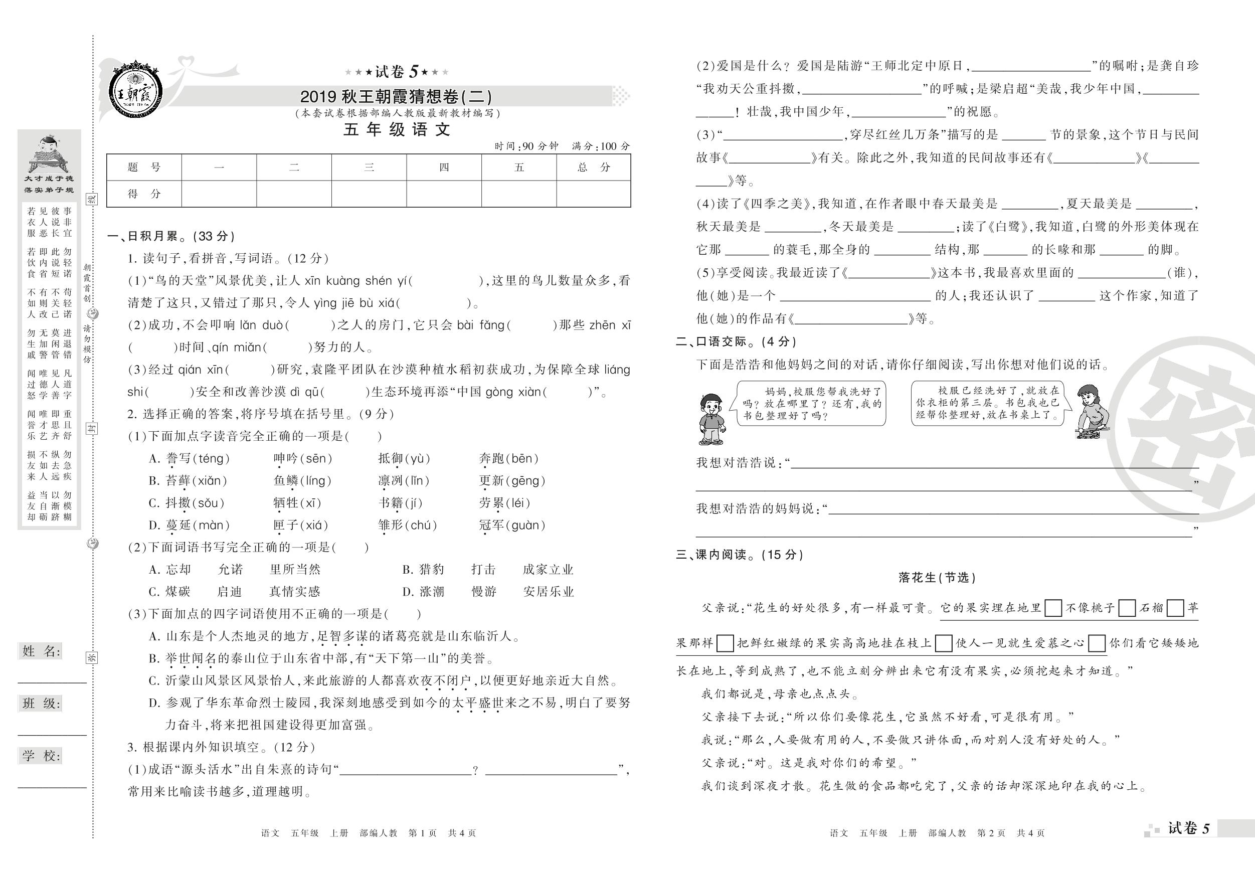 王朝霞期末猜想卷(二)五年级上册语文(人教版)【5】