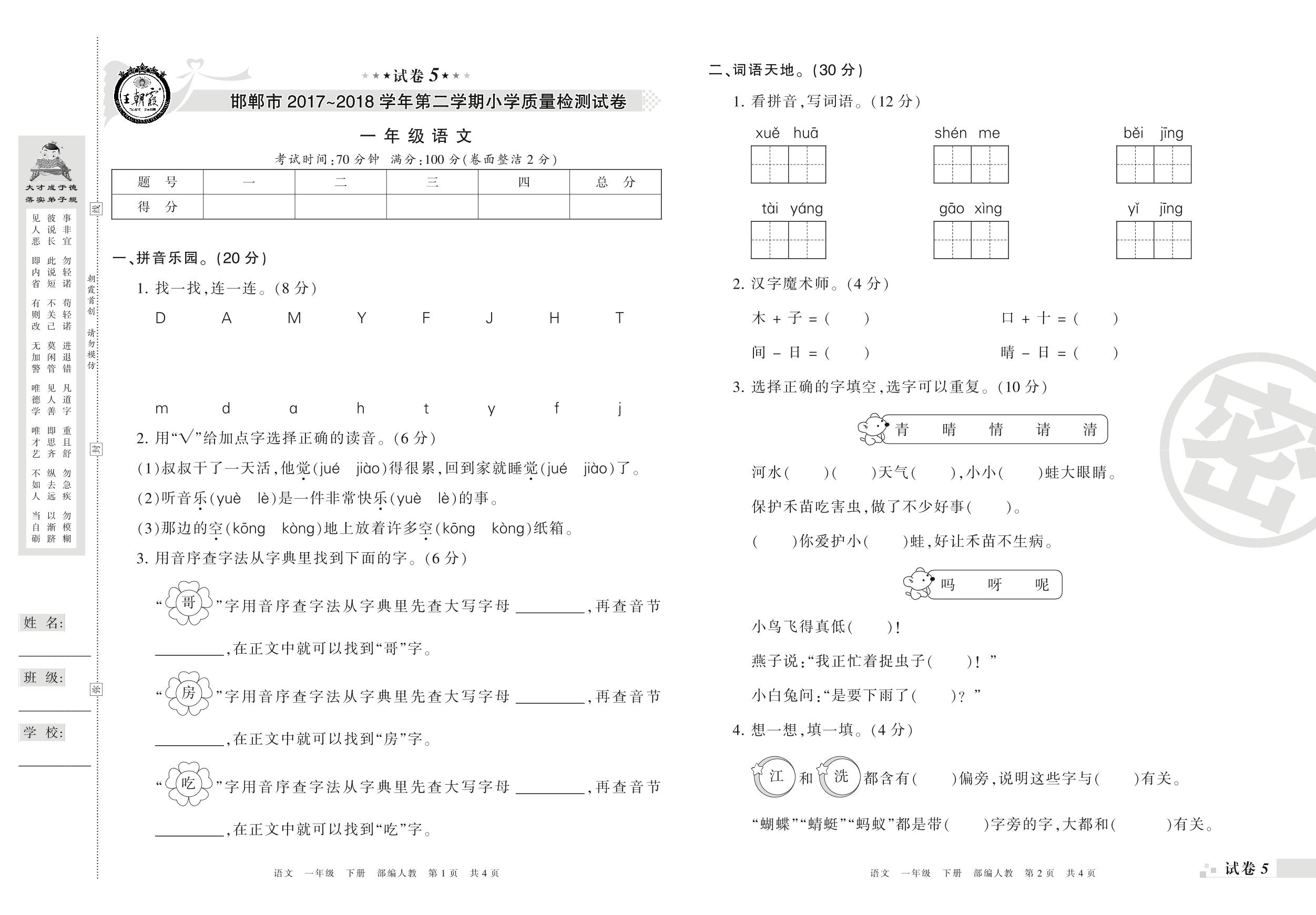 2017-2018学年第二学期邯郸市一年级语文试卷(人教版)【5】