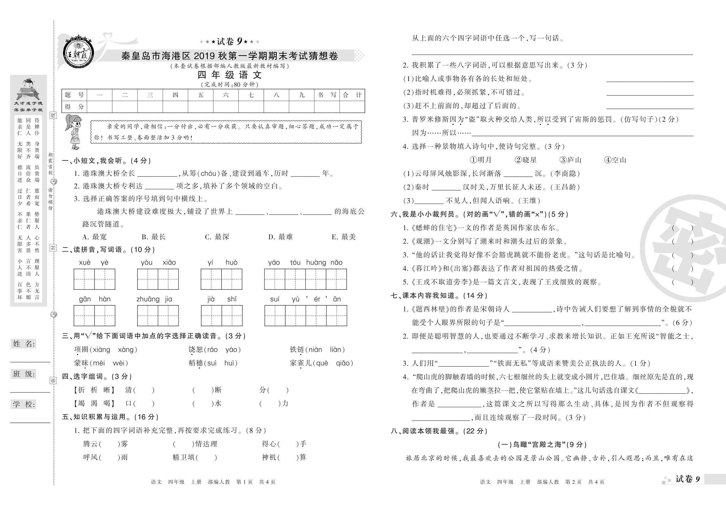 2018-2019学年第一学期秦皇岛市海港区猜想卷四年级语文试卷(人教版)【9】