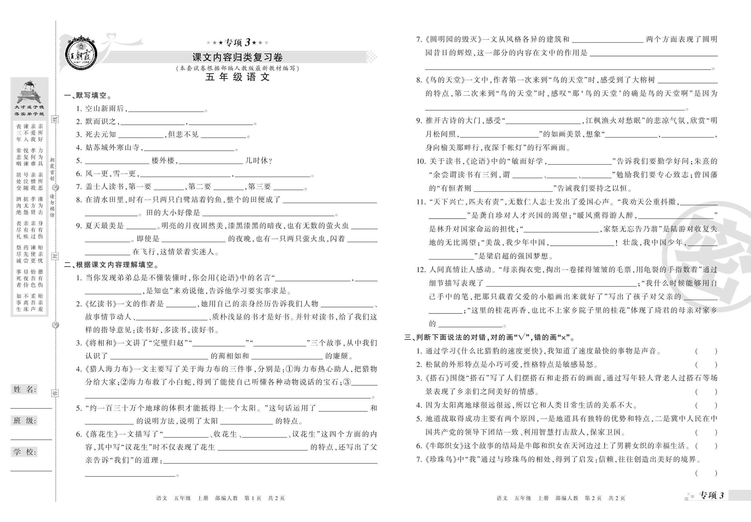 王朝霞期末专项卷——课文内容、积累运用真题归类复习卷五年级上册语文(人教版)_R210801195444【0】